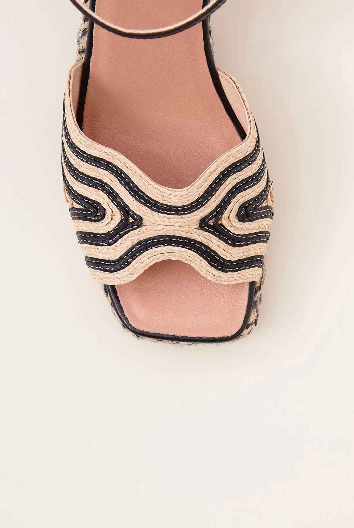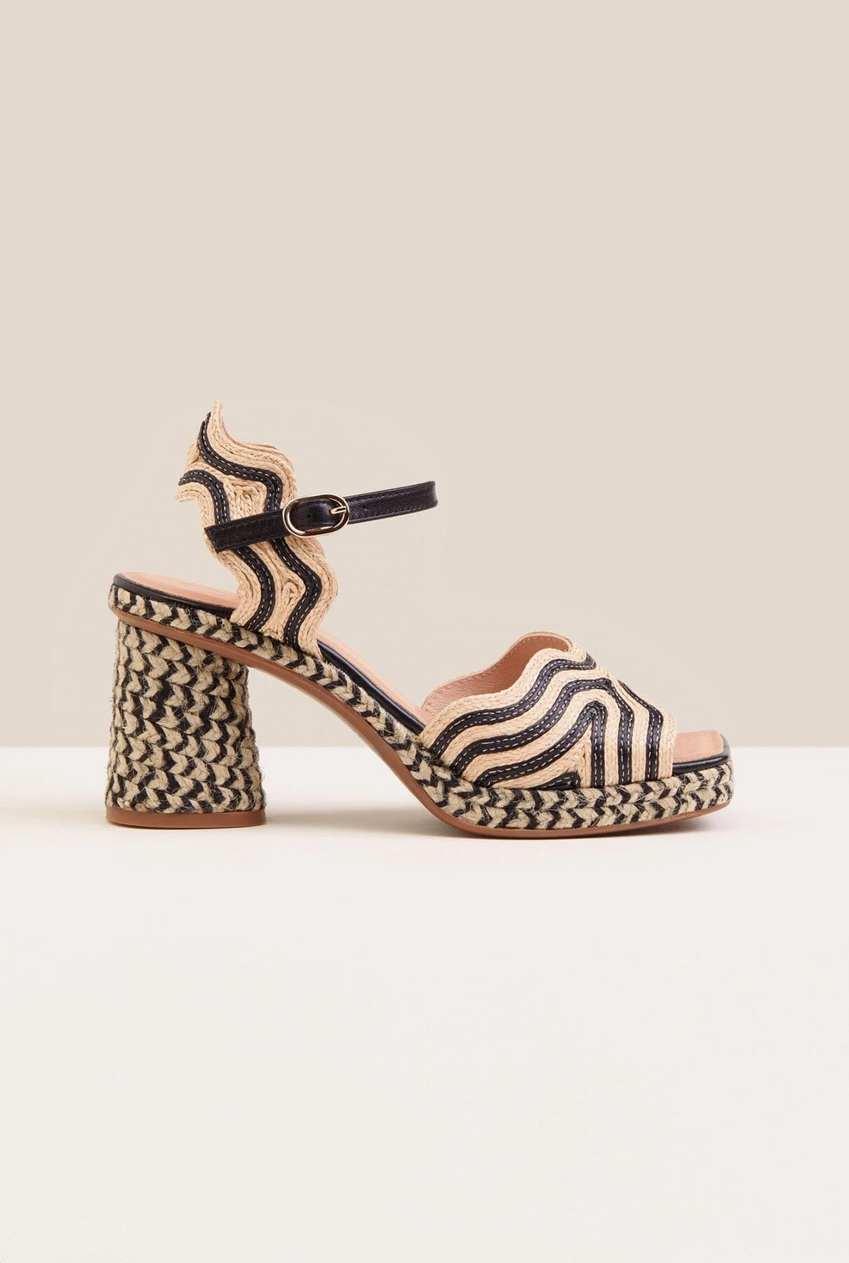 Gaimo women’s espadrille in cotton raffia. Two-tone Danae style with straps and open heel with wave detailing and side buckle closure. Designed and traditionally crafted in Spain, this is a comfortable and sophisticated design with outstanding versatility ready to combine with your more casual looks or for a special occasion as an event guest or a bride-to-be.