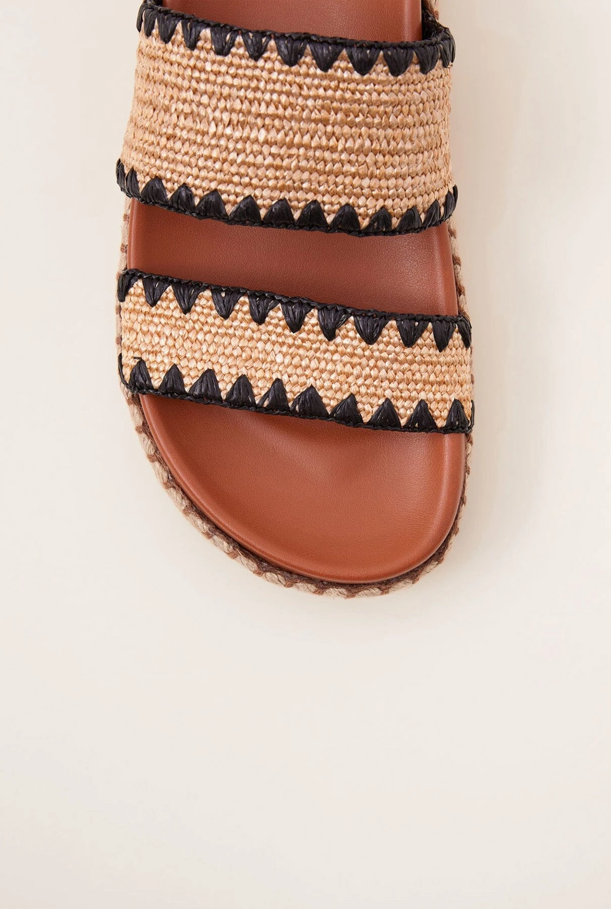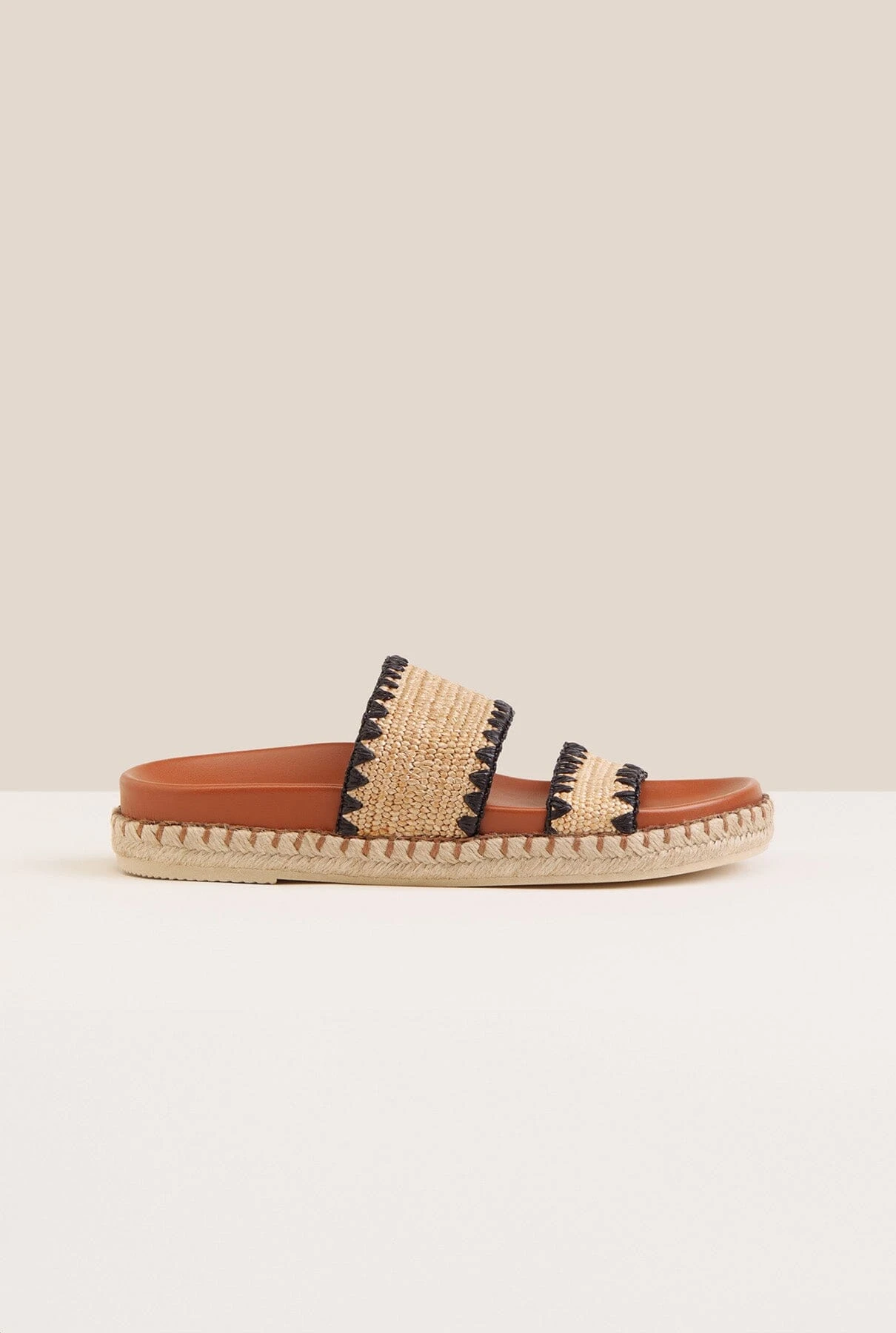 Gaimo women’s espadrille in stretch raffia fabric. Ona mule featuring two wide straps with hand-stitched colour-contrast thread detail. Designed and produced using traditional methods in Spain, they’re a perfect blend of comfort and style that’s ideal to combine with any of your summer looks.