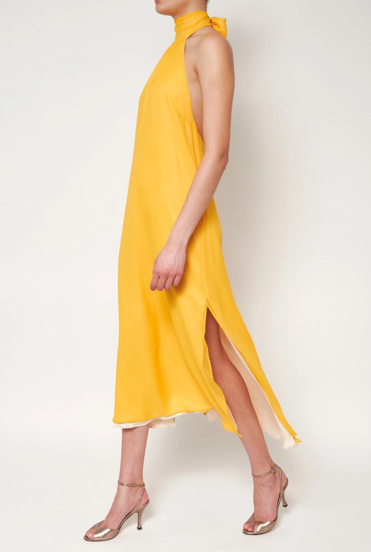 A very elegant and versatile sleeveless dress, easy to wear with heels, ballerinas, sandals or trainers. It is made of 100% silk crepe and is reversible, so you can wear it two days in a row or change the color when you like. It comes with a belt, and a long bicolor scarf allows you to tie it as you like around your back or around your body as a belt. Like everything in Aletheia, this dress is made with natural dyes from plants. For this piece we have used Gardenia.