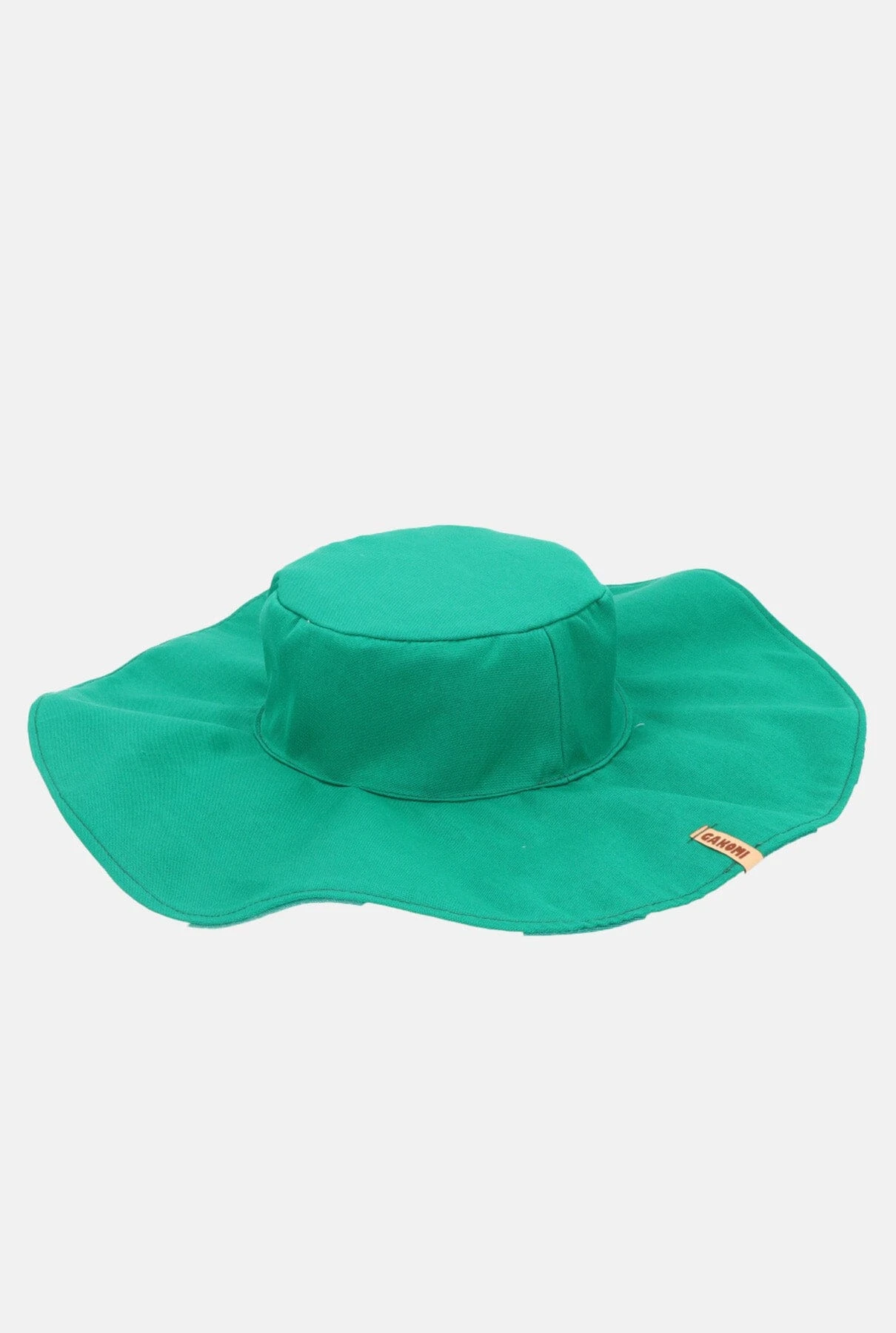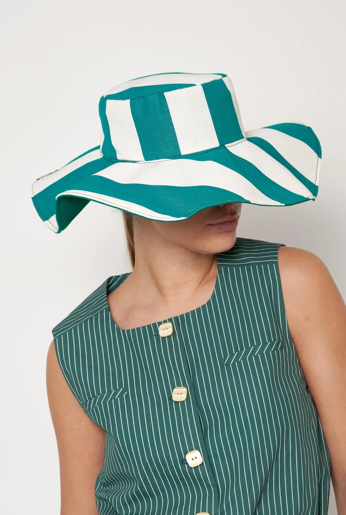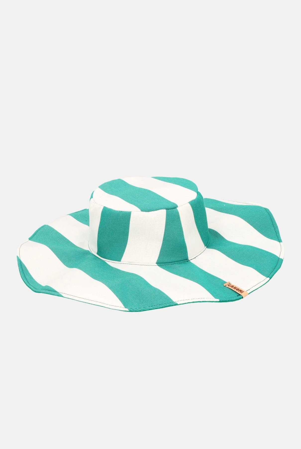 This cotton pamela is reversible so you can wear the design you prefer. On one side it has a lined pattern in green colour. The other side is all plain green colour. A perfect pamela for a your holiday or to wear everyday on your daily look.