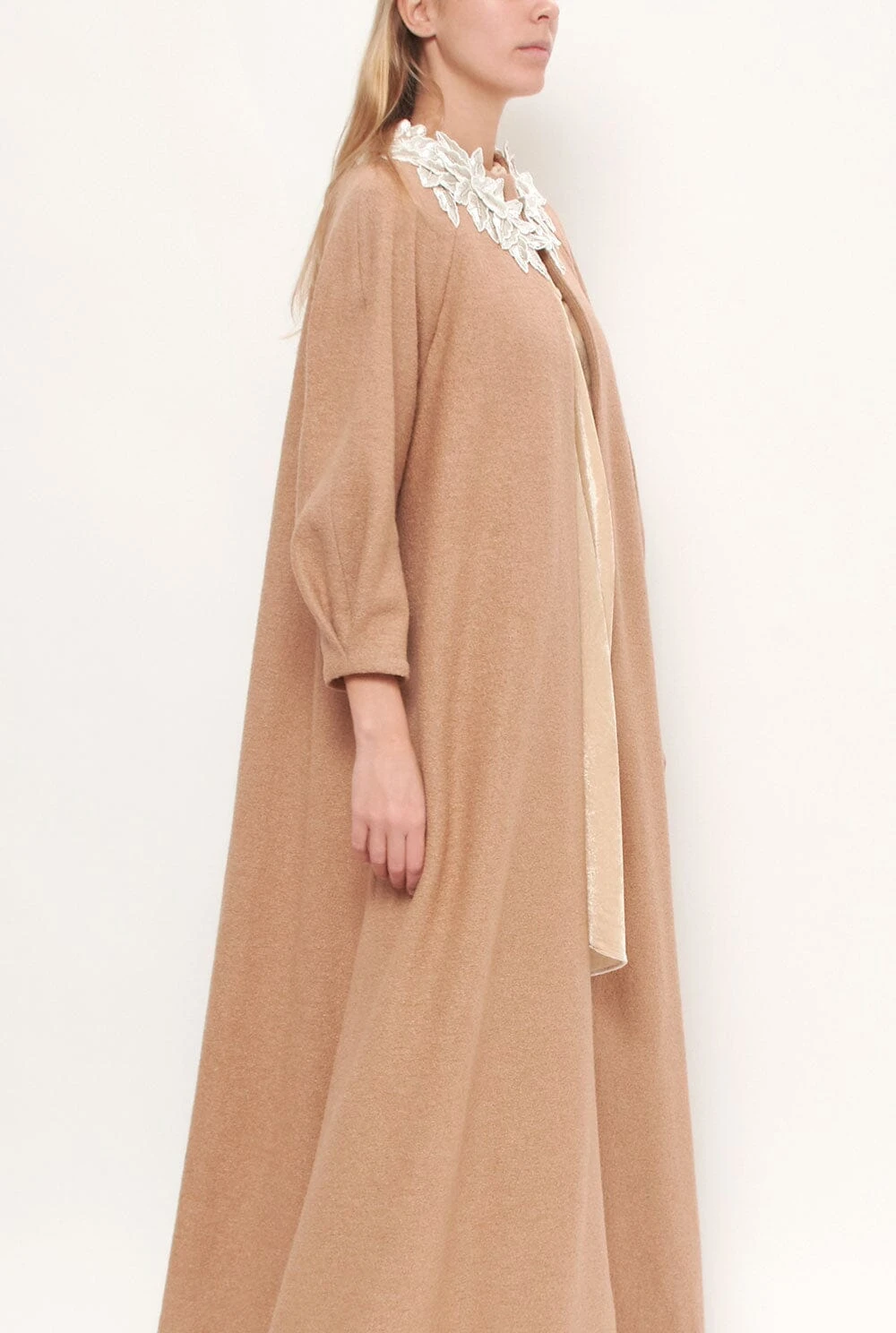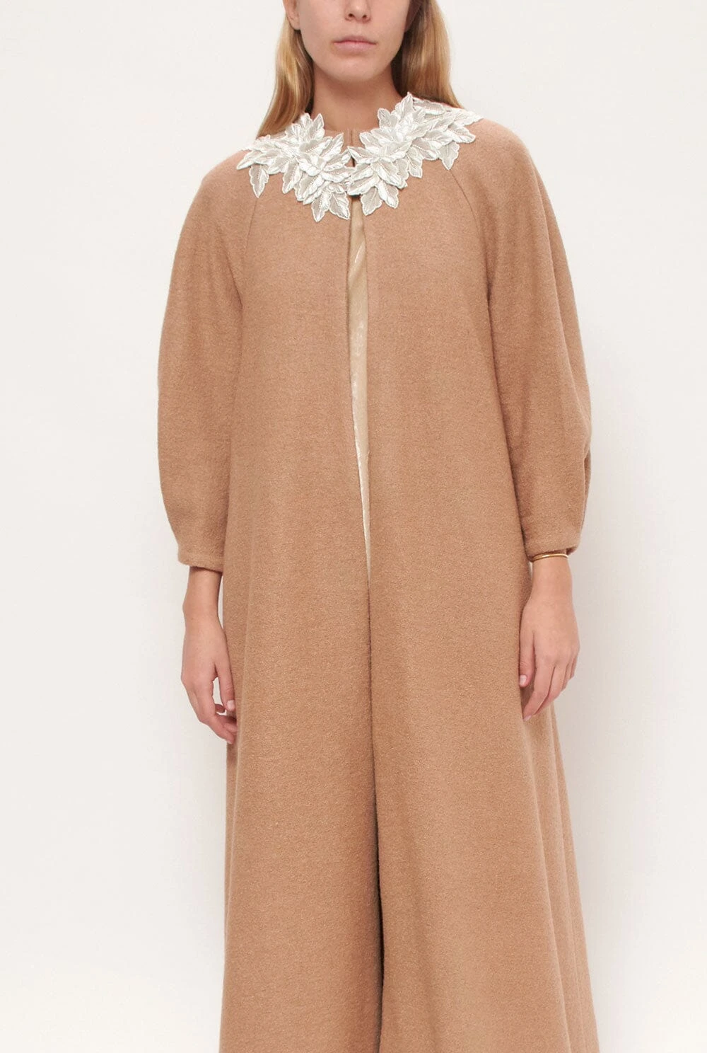 Hermione midi coat made of wool and rhinestones appliques in the neckline, highlated by its straight and minimal design is the perfect piece to complete a special and spectacular look.