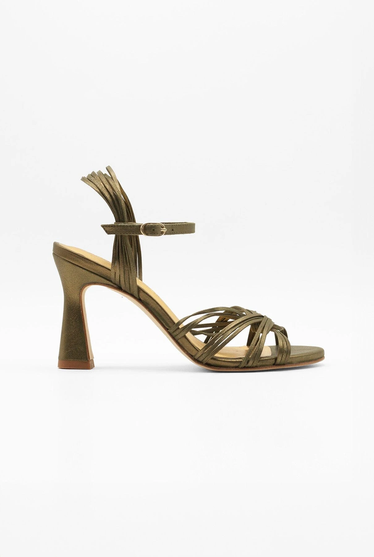 Strappy copper sandals with greenish tone, designed for brides and guests, handmade 100% in Spain. Comfortable and stable trapeze heel. Cushioned insole for greater comfort.