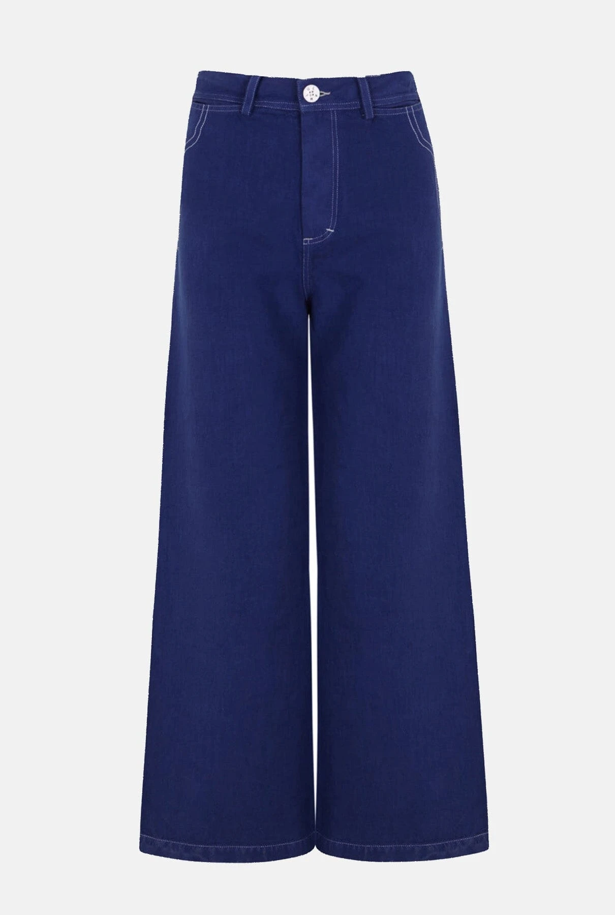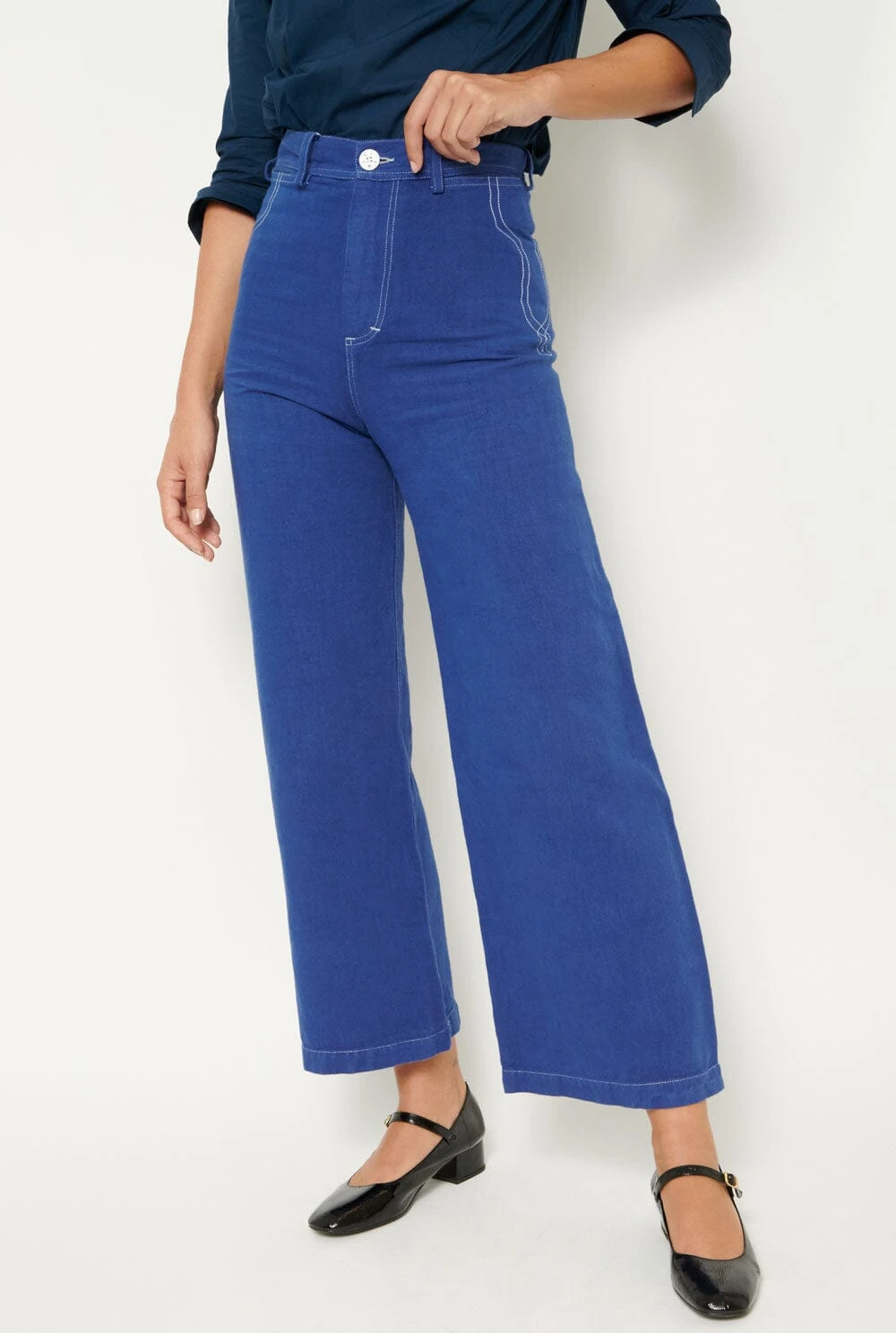 High waisted jeans in blue with a cropped fit. White stitching embroidery and personalized summarys. Sustainably and locally dyed using the latest technology and sustainable methods.