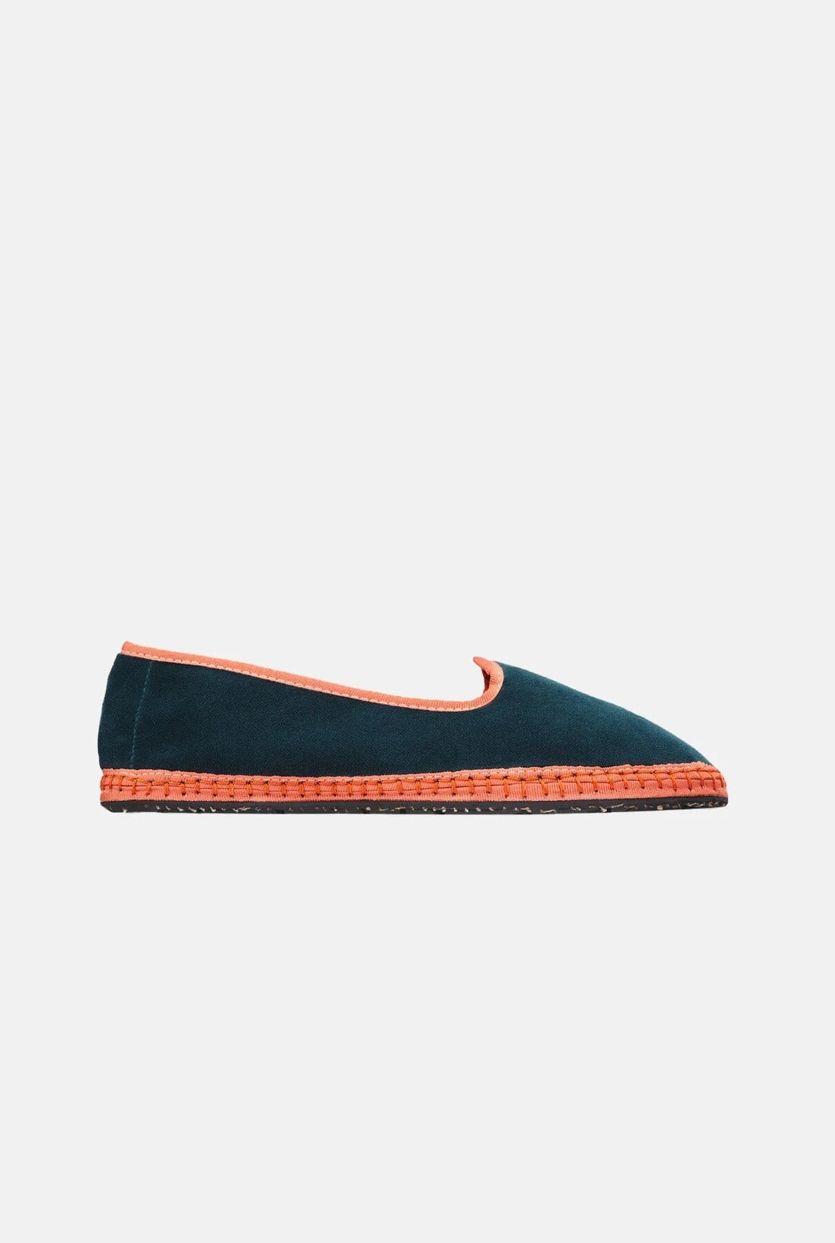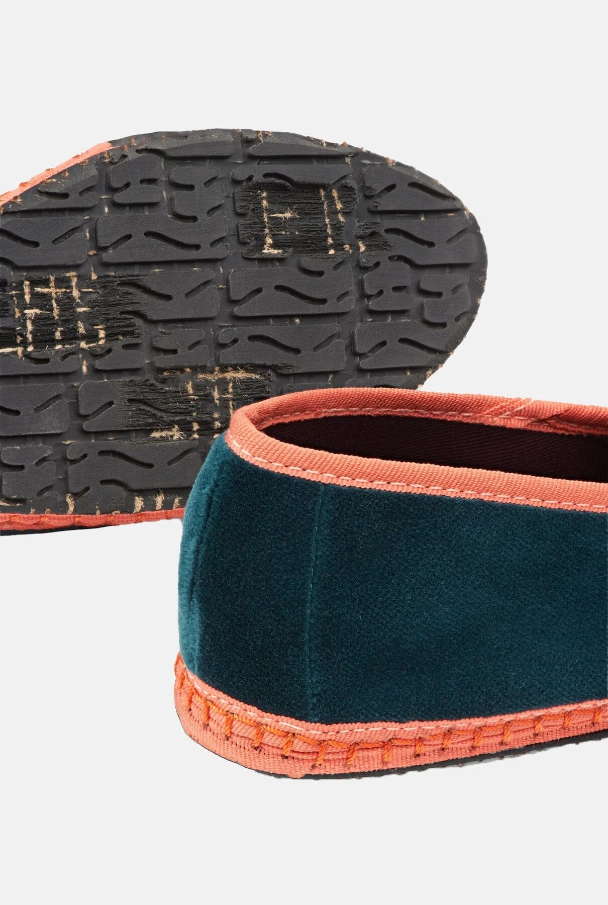 Gasoline velvet sneaker with bright orange contrast piping. The outside of the shoe is 100% cotton velvet, and the inside of the shoe is 100% eco-friendly cotton with antibacterial treatment. The sole is made of rubber produced from recycled bicycle tires.