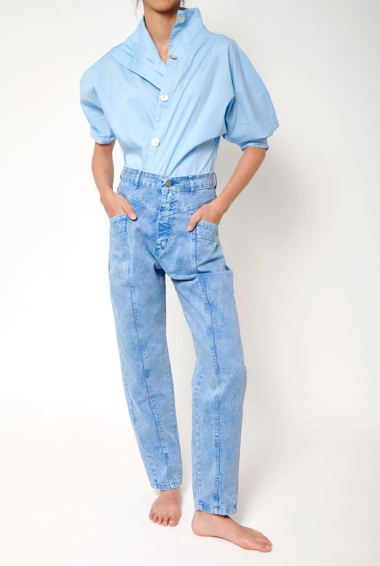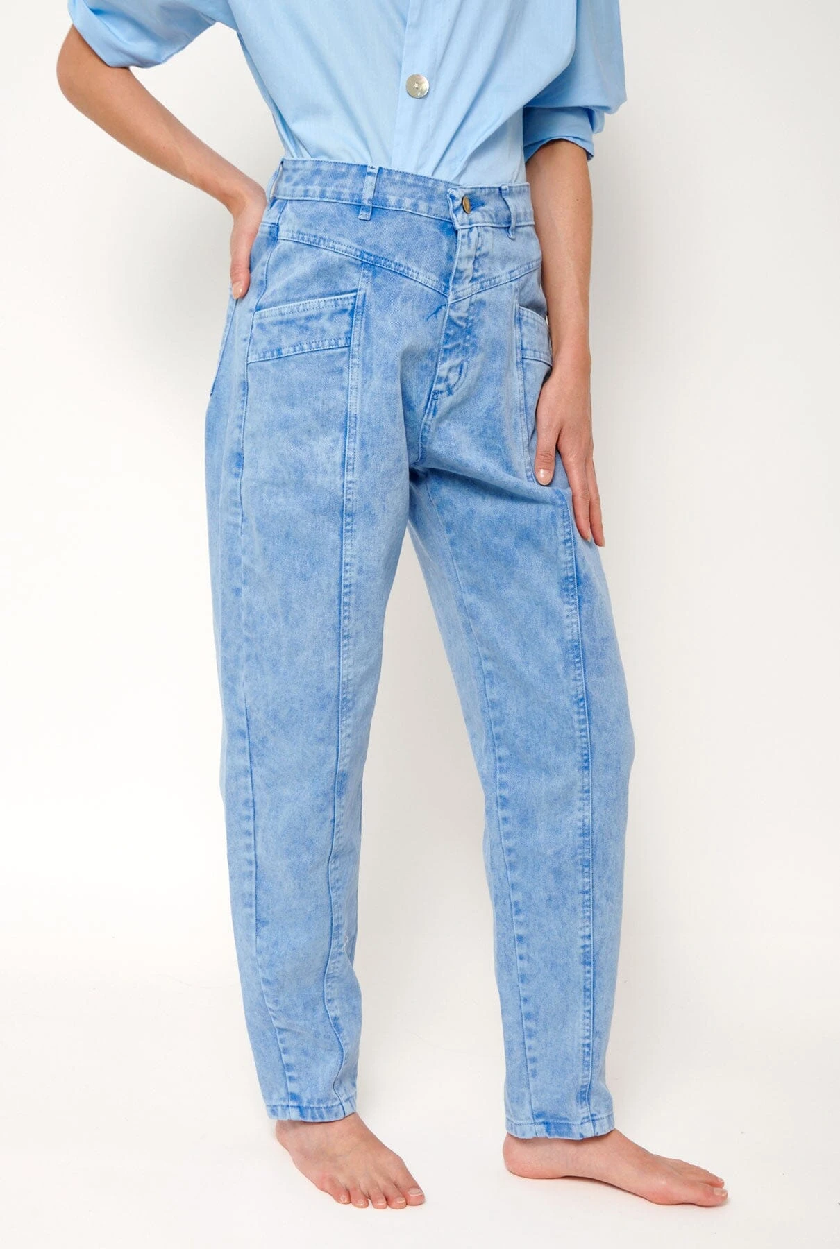Wide jeans, narrow at the ankle, with four pockets. Zip and summary fastening. Front seam detail.