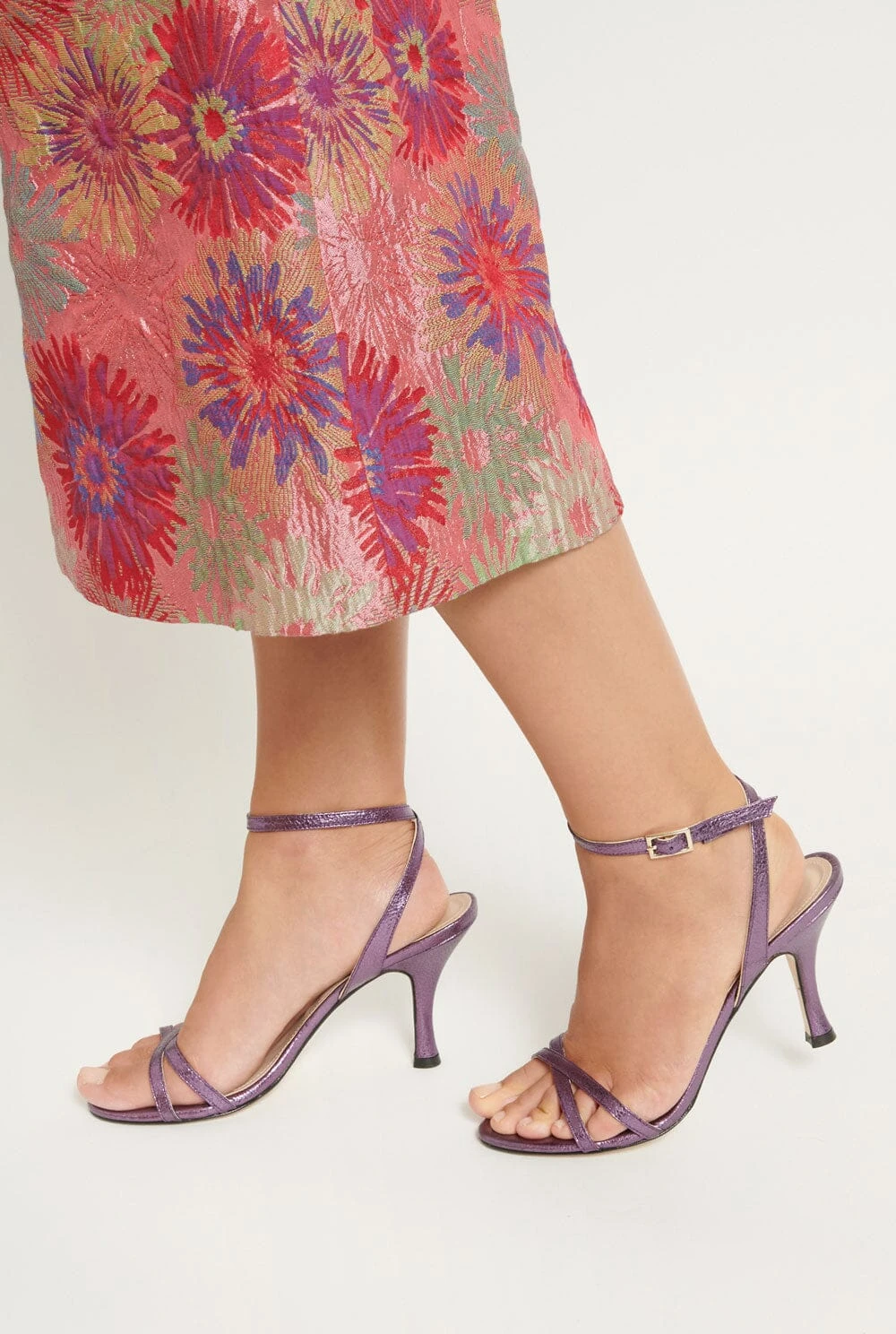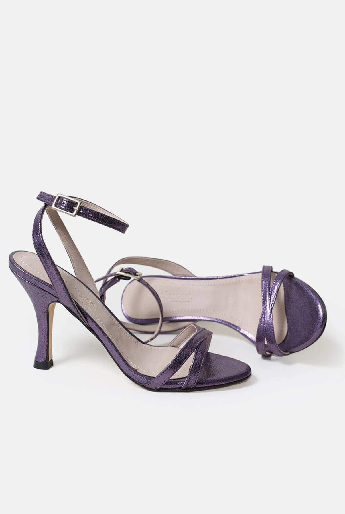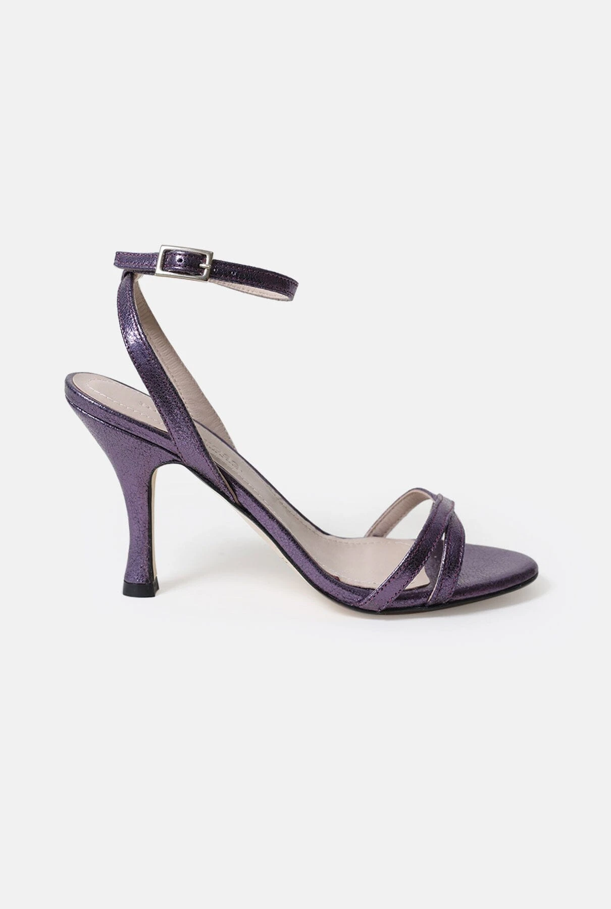 The two crossed leather straps at the front skirt the foot and give it a slender look. A thin strap with a buckle fastening completes the support. Flared heel 9 cm.