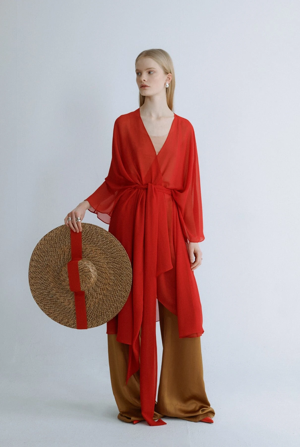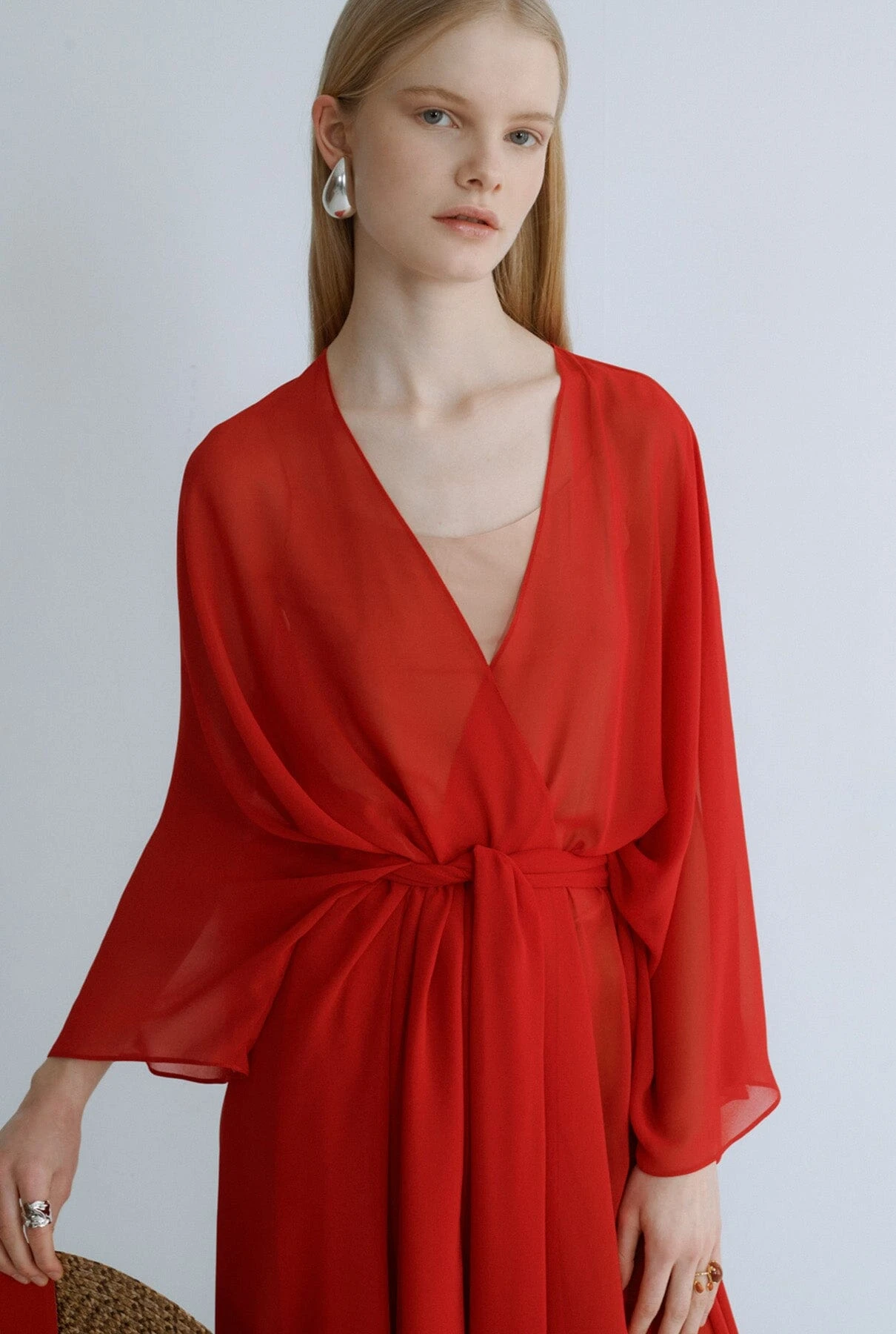 Red georgette kimono by Miguel Marinero. Versatile design to wear with a casual look or sophisticated dresses. Fastens with a lace-up belt.