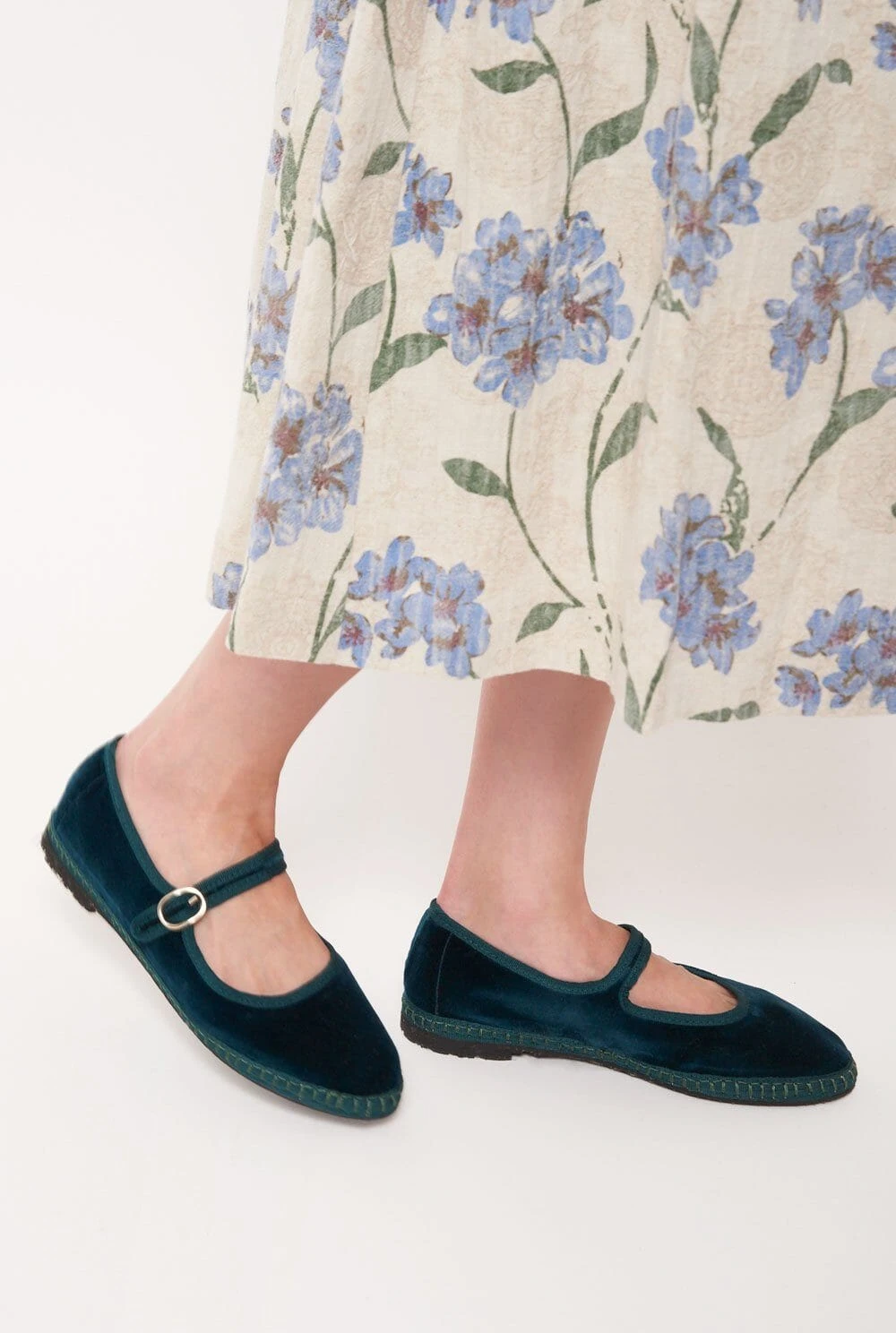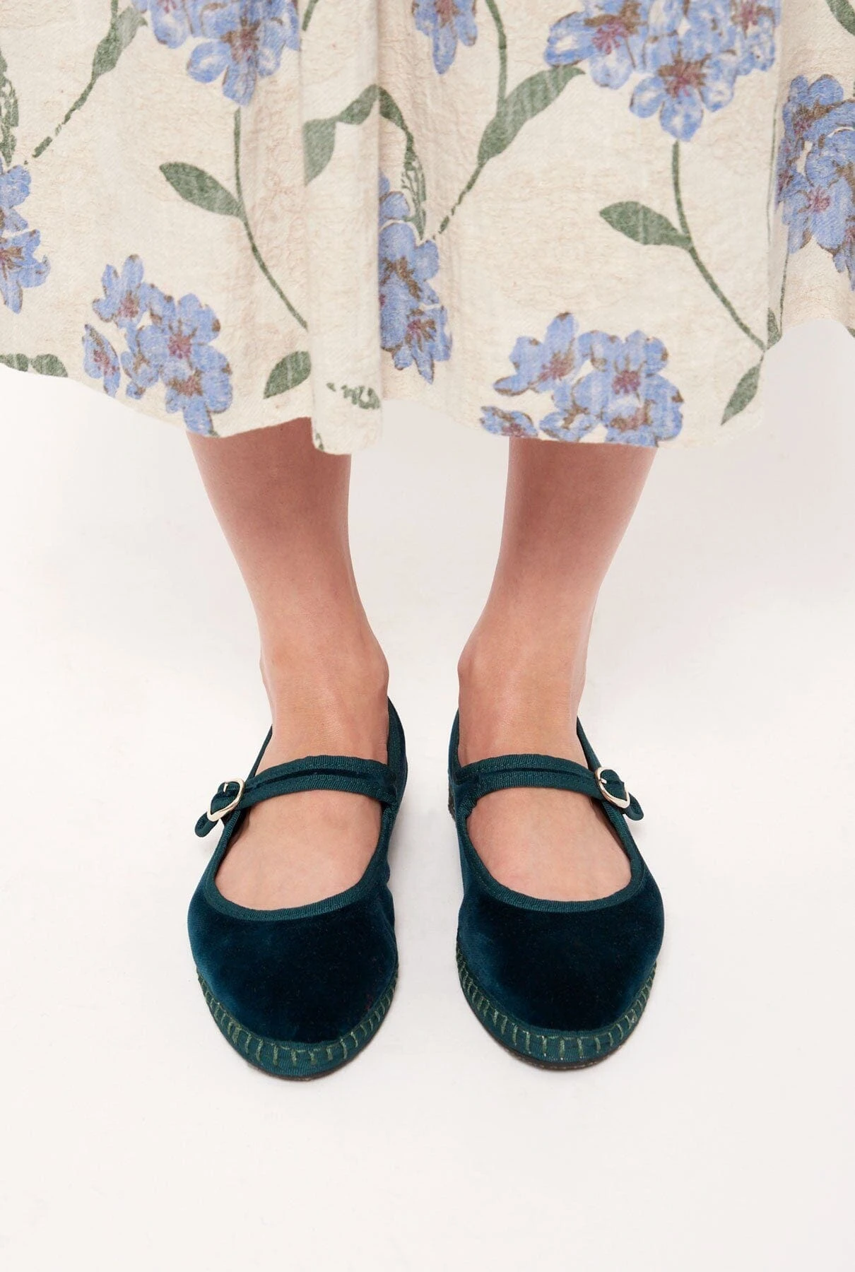 Velvet mary jane in petrol green with green piping and buckle closure. The outside of the shoe is 100% cotton velvet, and the inside of the shoe is 100% ecological cotton with anti-bacterial treatment. The sole is made of rubber produced from recycled bicycle tyres.
