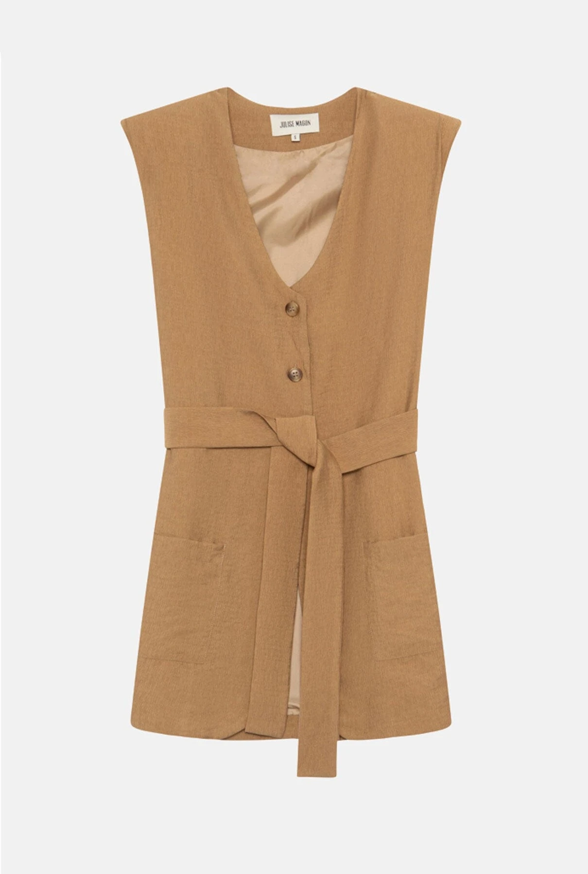 Camel long vest with a light satin finish. Closure with summarys and belt to tie with lacing. With plastron pockets and placket at the bottom of the waistband. For a complete look, it can be combined with Elisa Bermuda shorts.