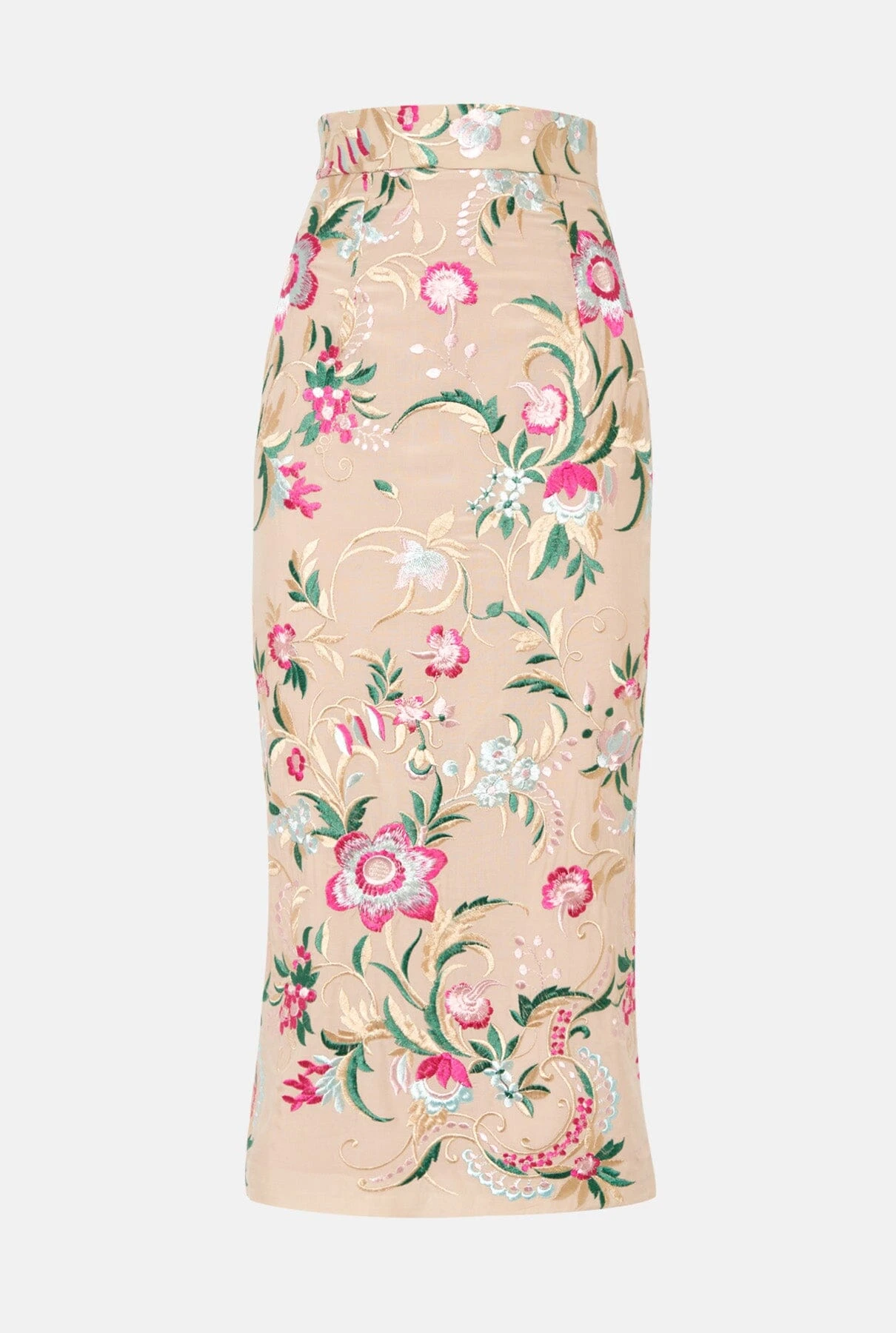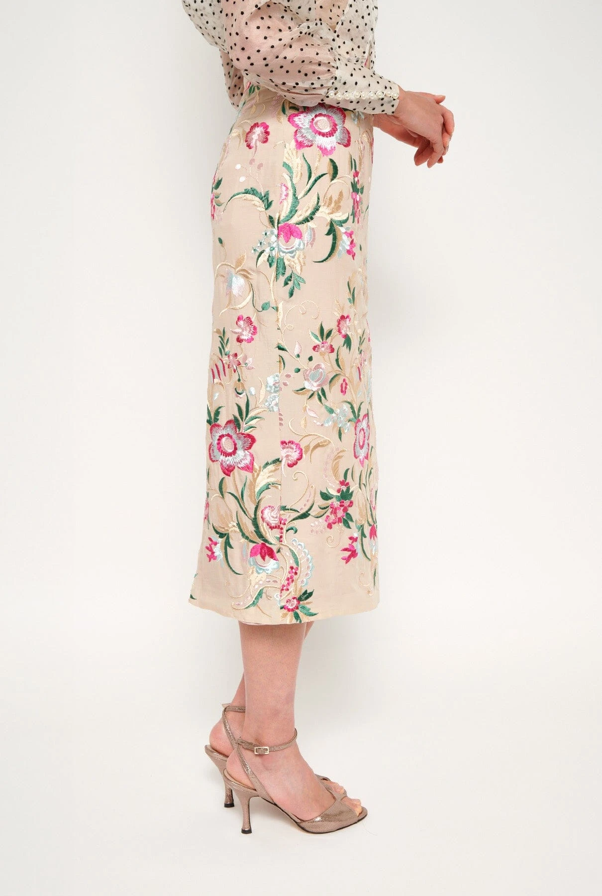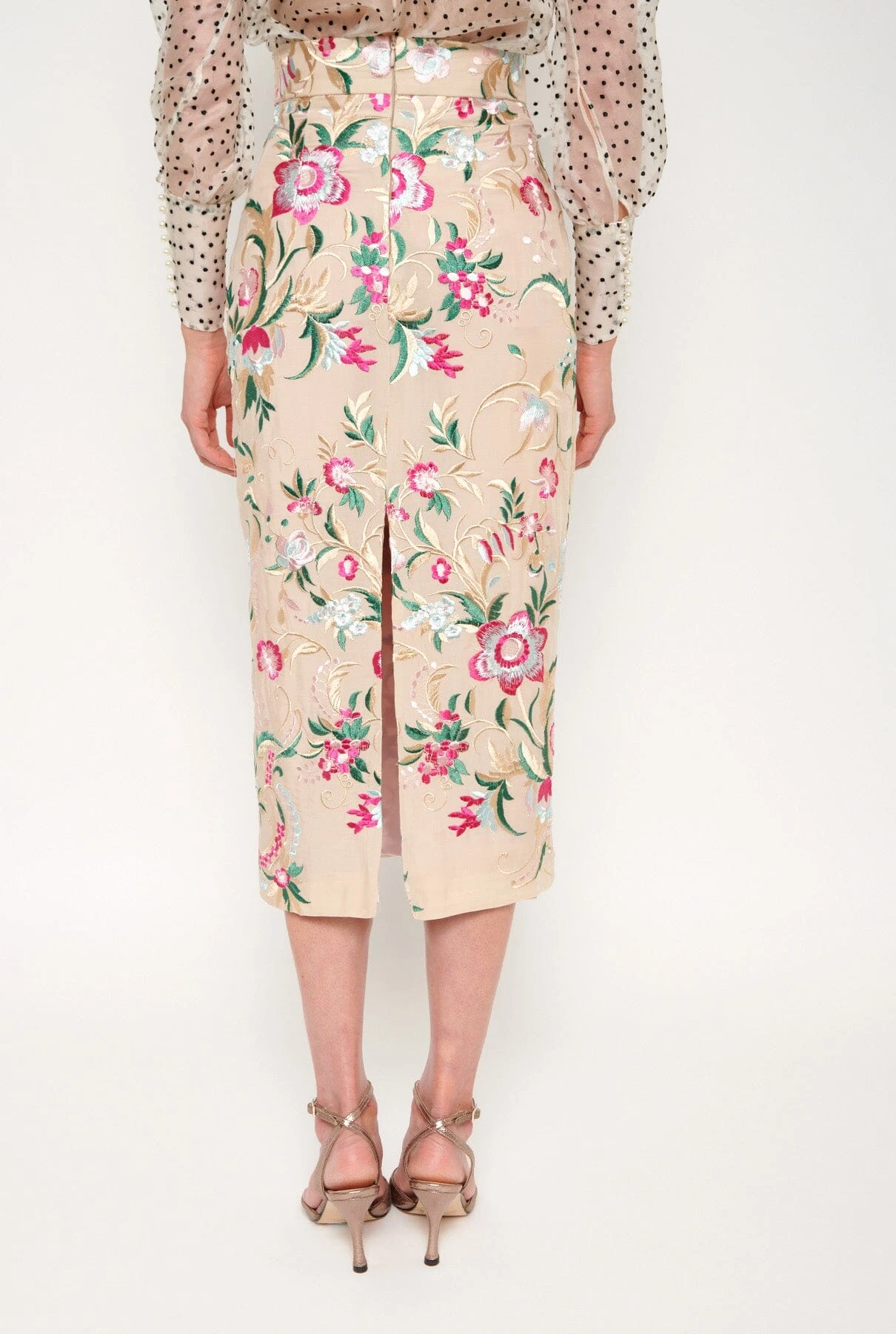 Pencil skirt, with manila motif fabric with embrodery multicolor flowers. Zip at the back, front and back pliers and waistband.