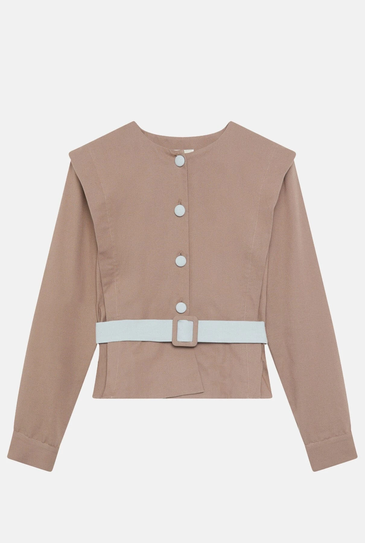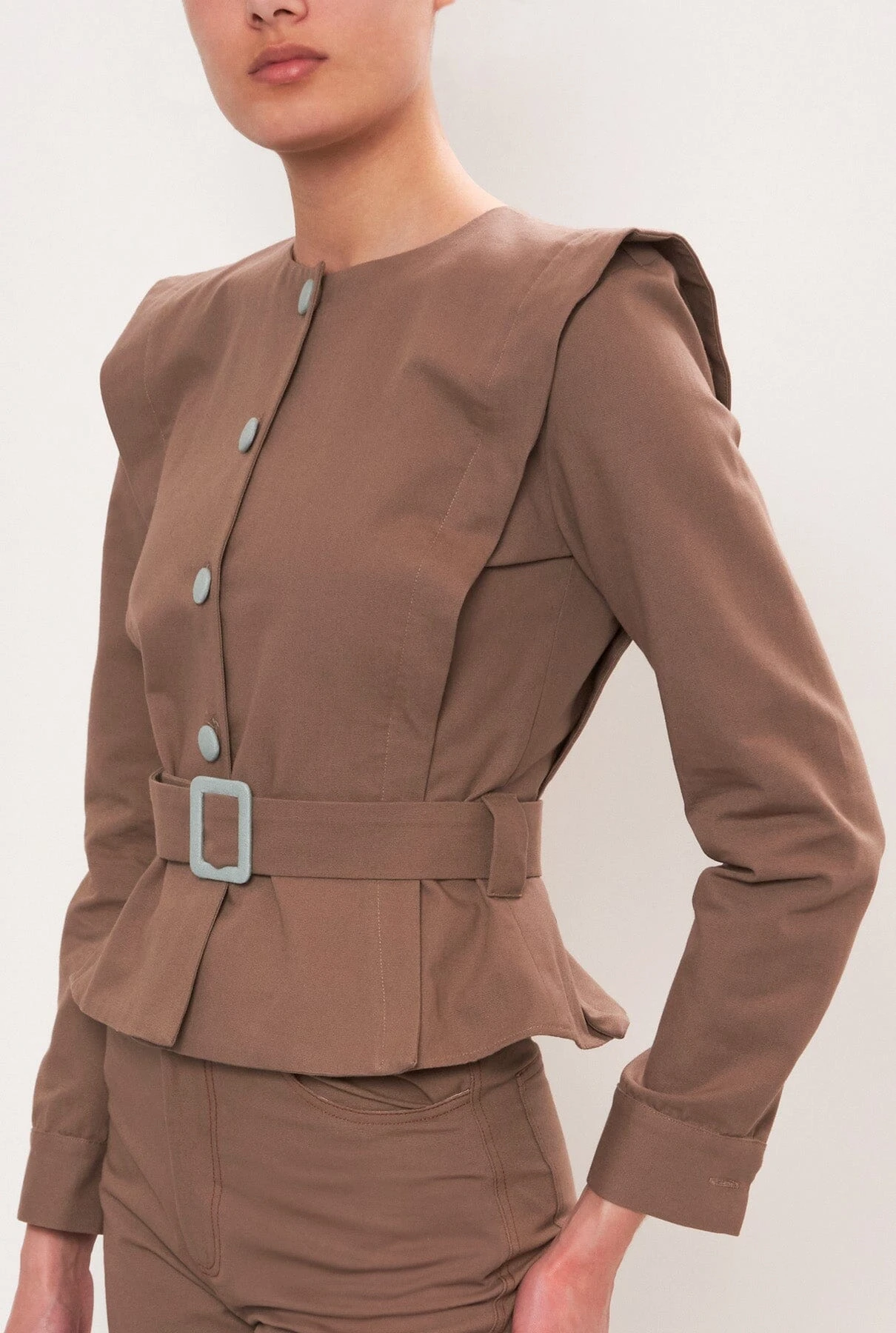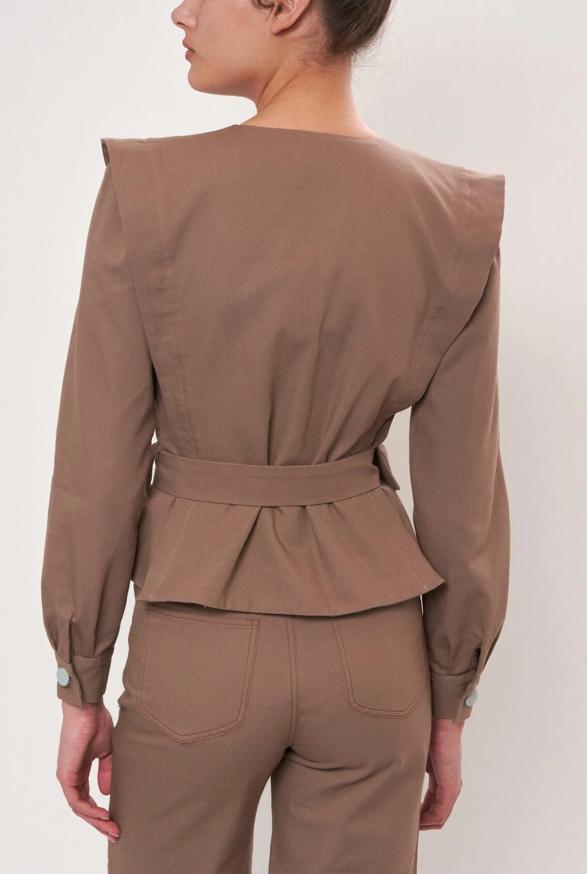 Canvas jacket with covered summarys and belt with contrasting buckle. With Julise Magon’s characteristic ruffle on the shoulders and along the body. Slightly peplum shape. For a complete look, we suggest pairing it with the Coro blues and browns trousers. In 2 colour combinations: Taupe/Lead blue and Lead blue/Taupe.
