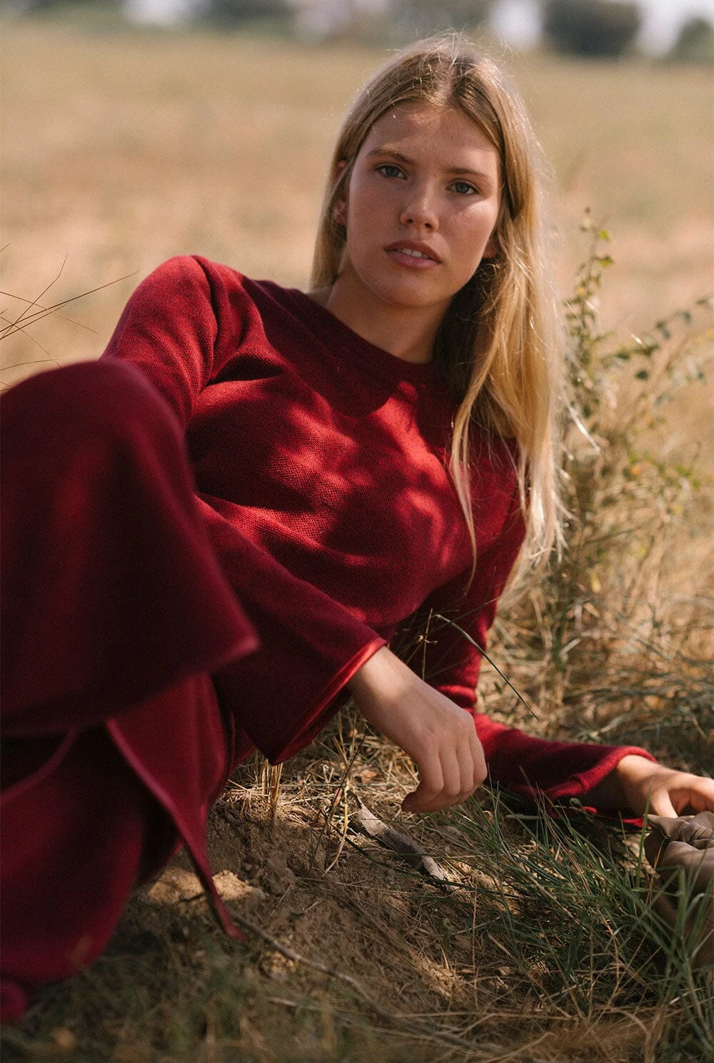 Laia Alen’s lupe top. Made from a unique blend of wool and cashmere, this stretch knit pique crew neck top features flared sleeves with satin finishing touches. Pair it with the lupe skirt for a chic and cohesive look.