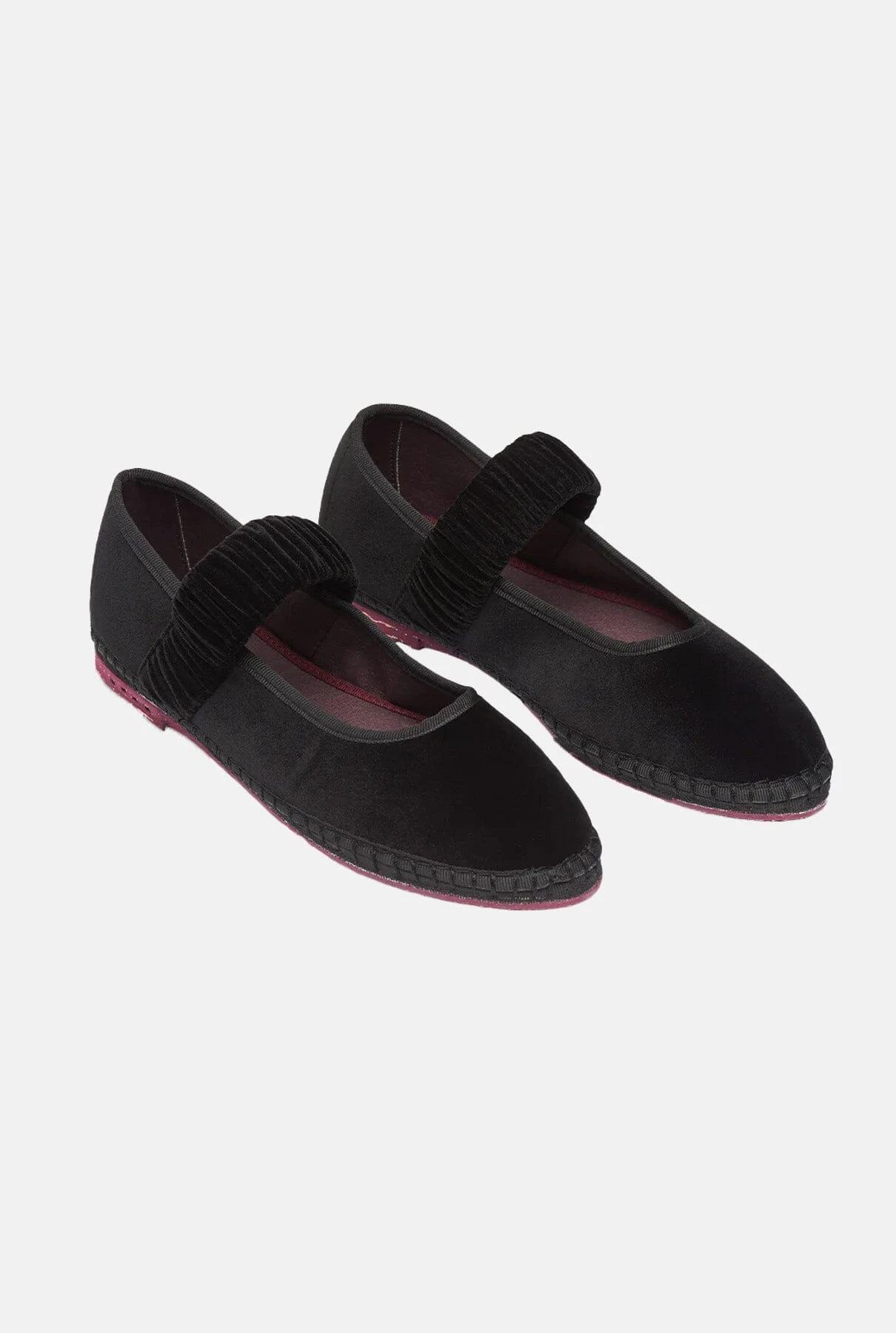 Ballerina with round hollow in black cotton velvet and elastic velvet strap over the instep. The outside of the shoe is 100% cotton velvet, and the inside shoe is made of breathable organic cotton lining and insole in 100% breathable antibacterial fabric. The sole is made of rubber produced from recycled bicycle tires.