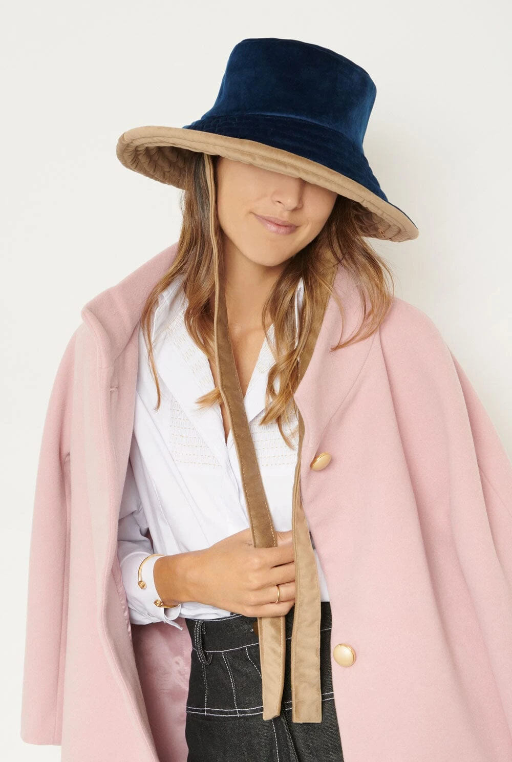 The reversible bicolour hat is made with blue velvet and latte velvet. Its reversible so you will be able to wear one hat or the other. It has two laces so you will be able to tye it up.