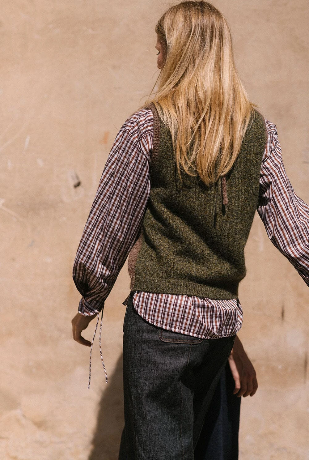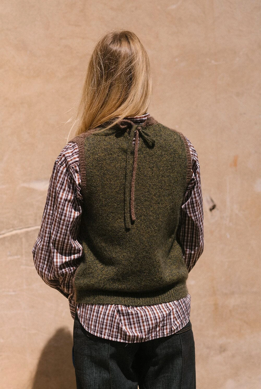 The mumu crew neck vest is a sleeveless knit made from 100% wool in two different colours. Accented with a knitted ribbon closure at the back.