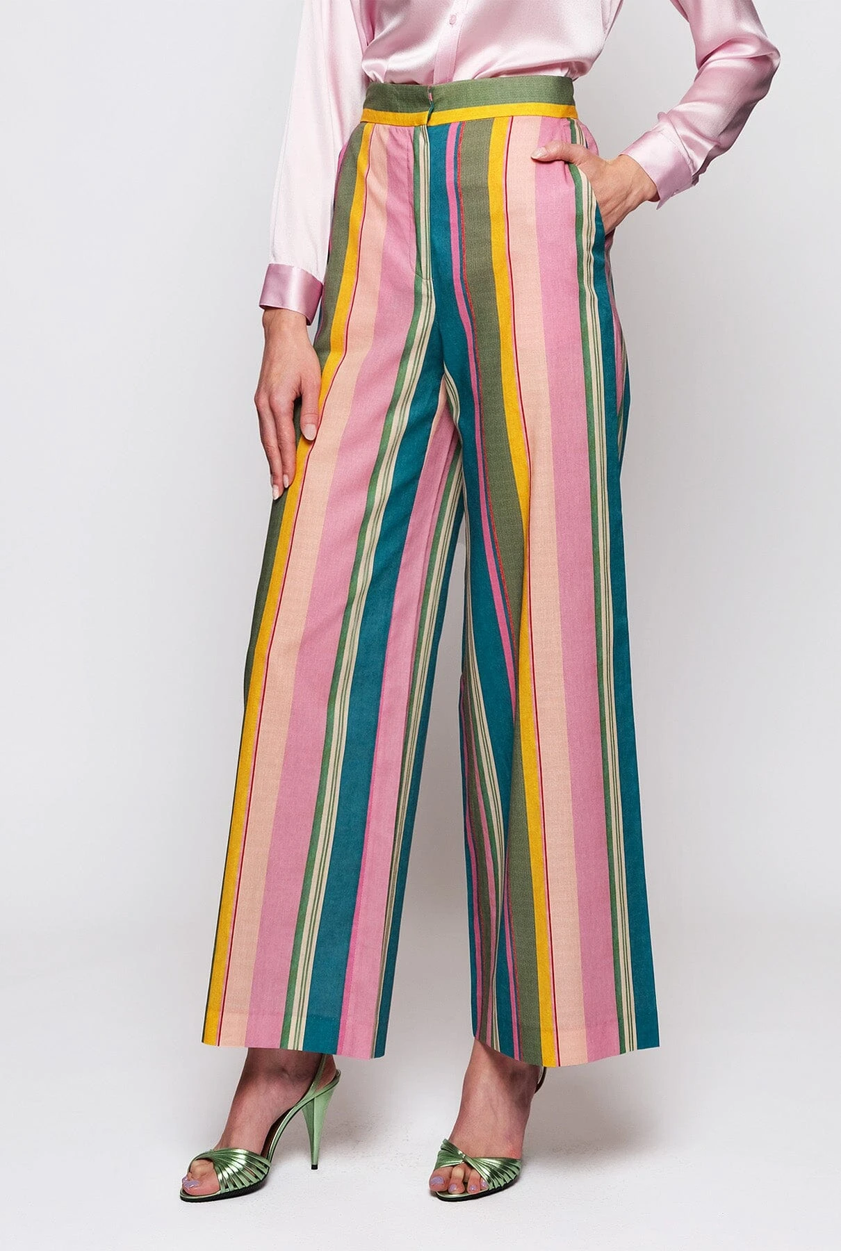 Cotton & linen striped Liberty print high rise, wide leg, trousers. Hidden closure, zip, hook & summary. Two side front pockets & two back pockets with piping.