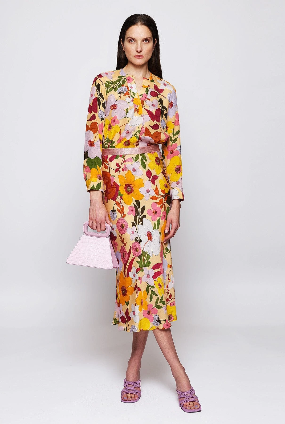 Midi, bias cut floral print skirt. Fancy, elastic waistband.