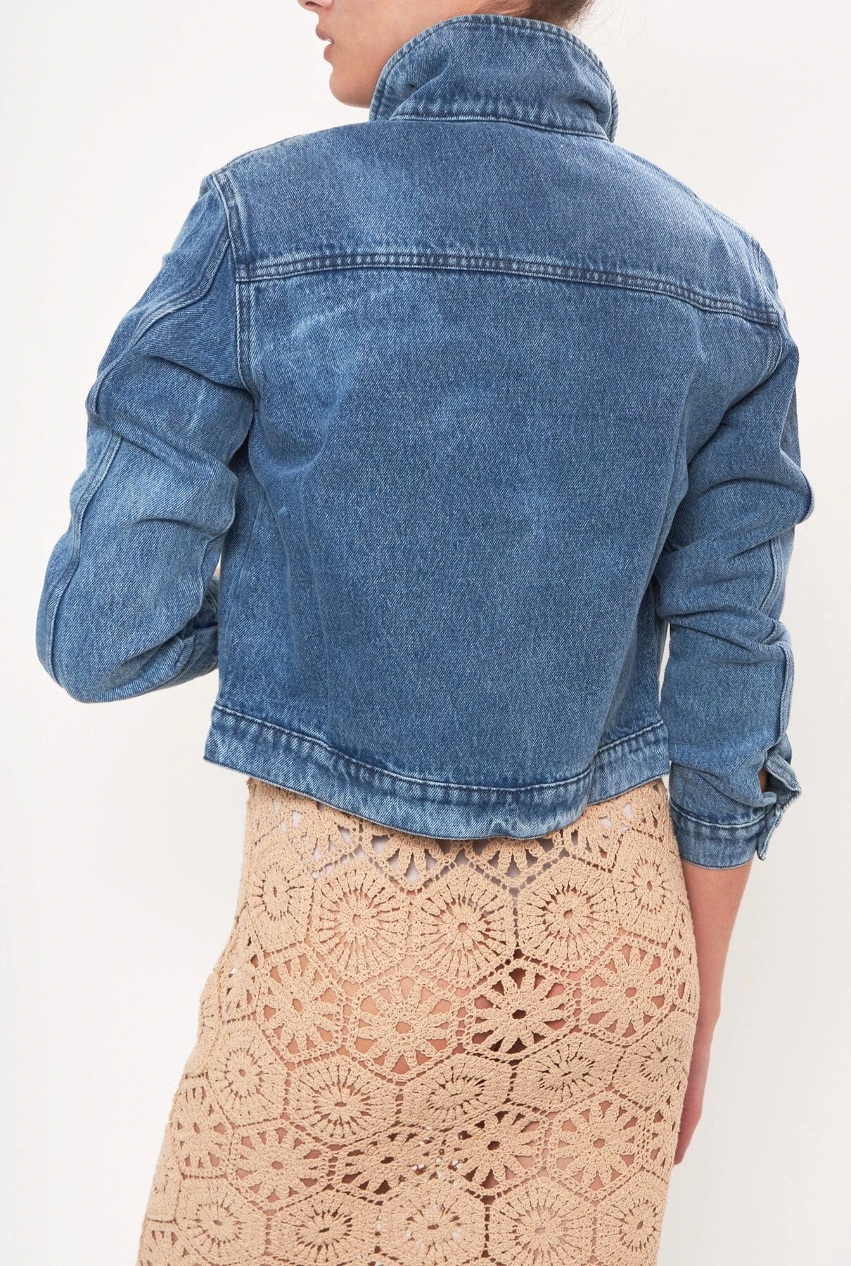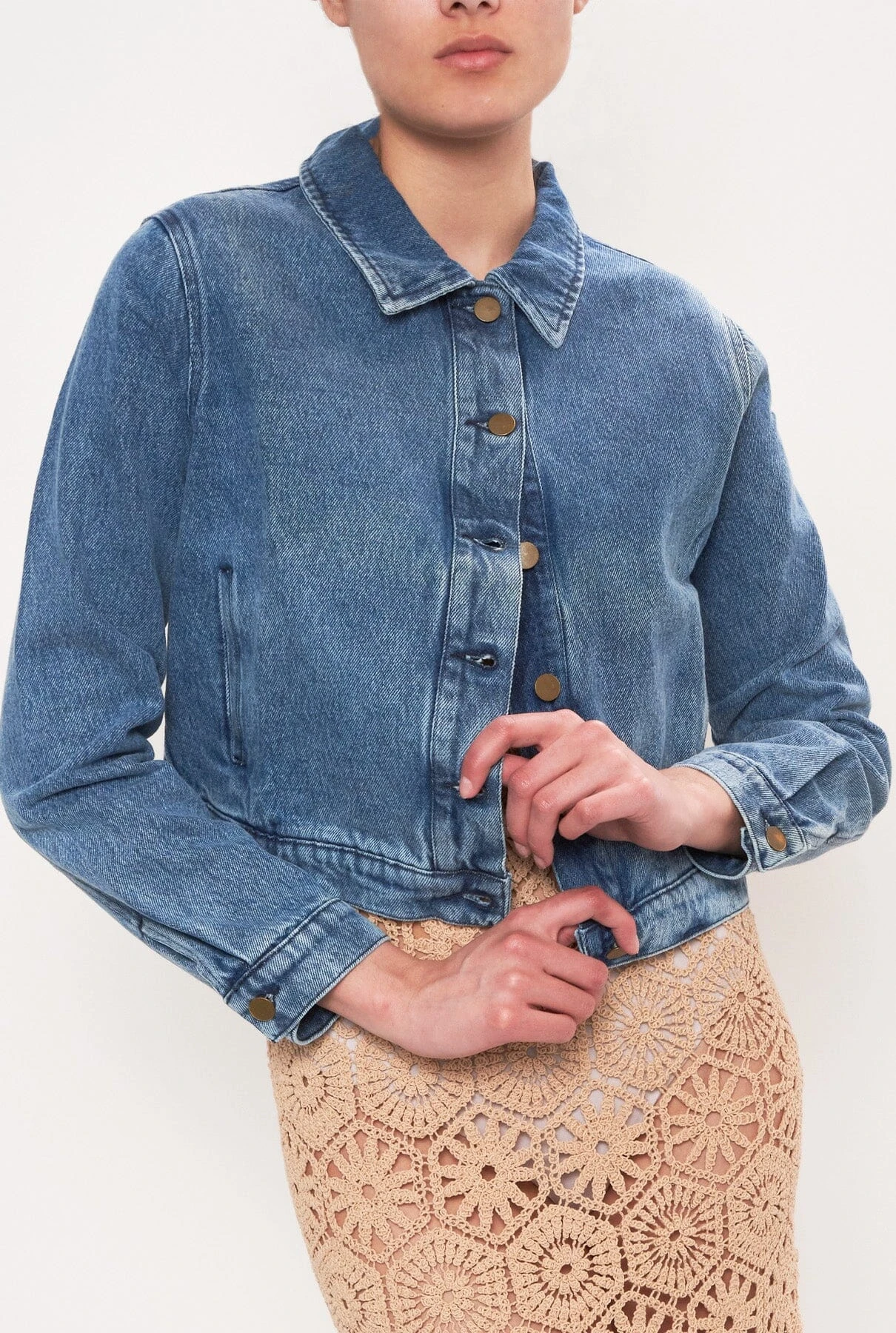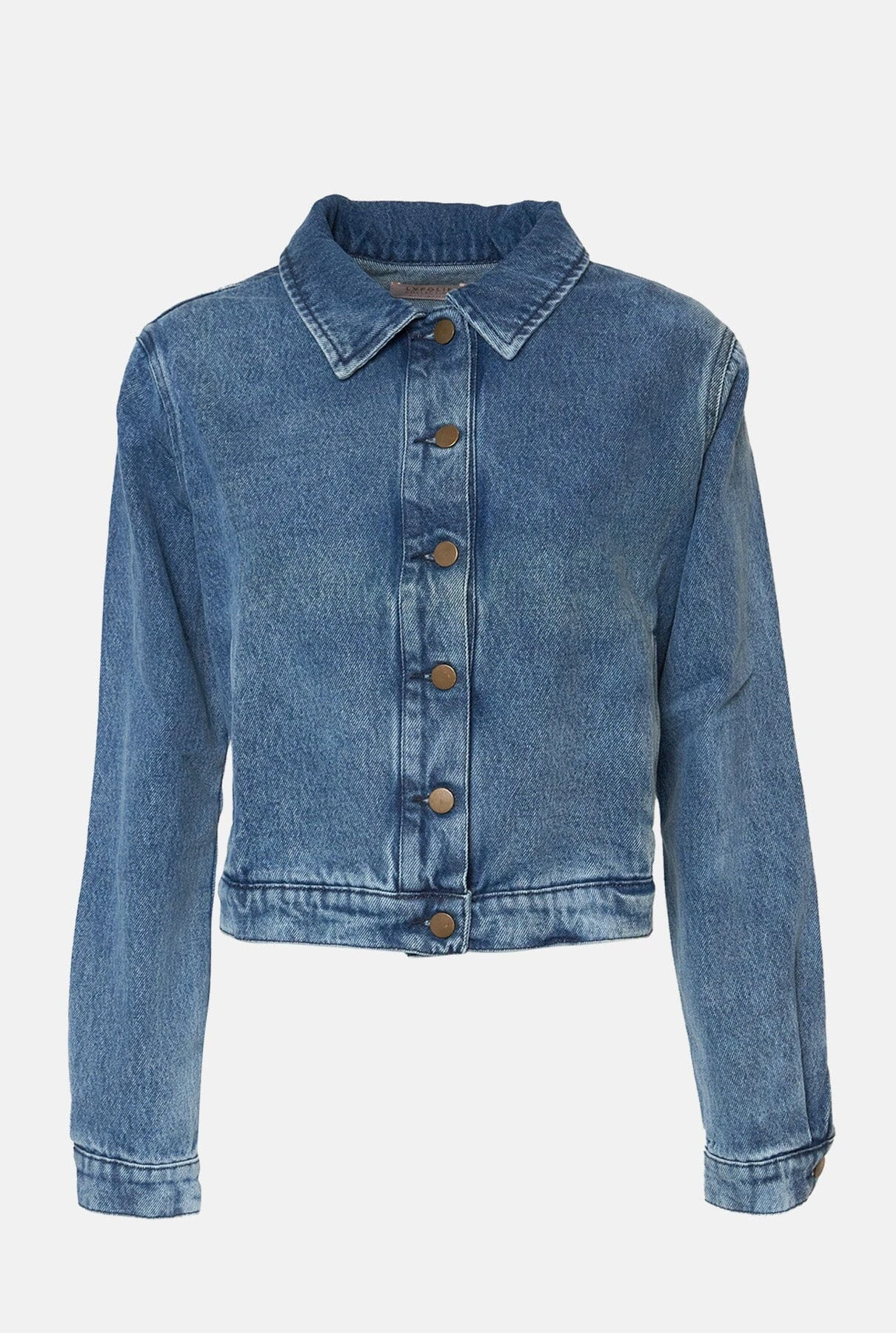 Denim Jacket with lapel collar and long sleeve. Front closure with gold metal summarys and side pockets.