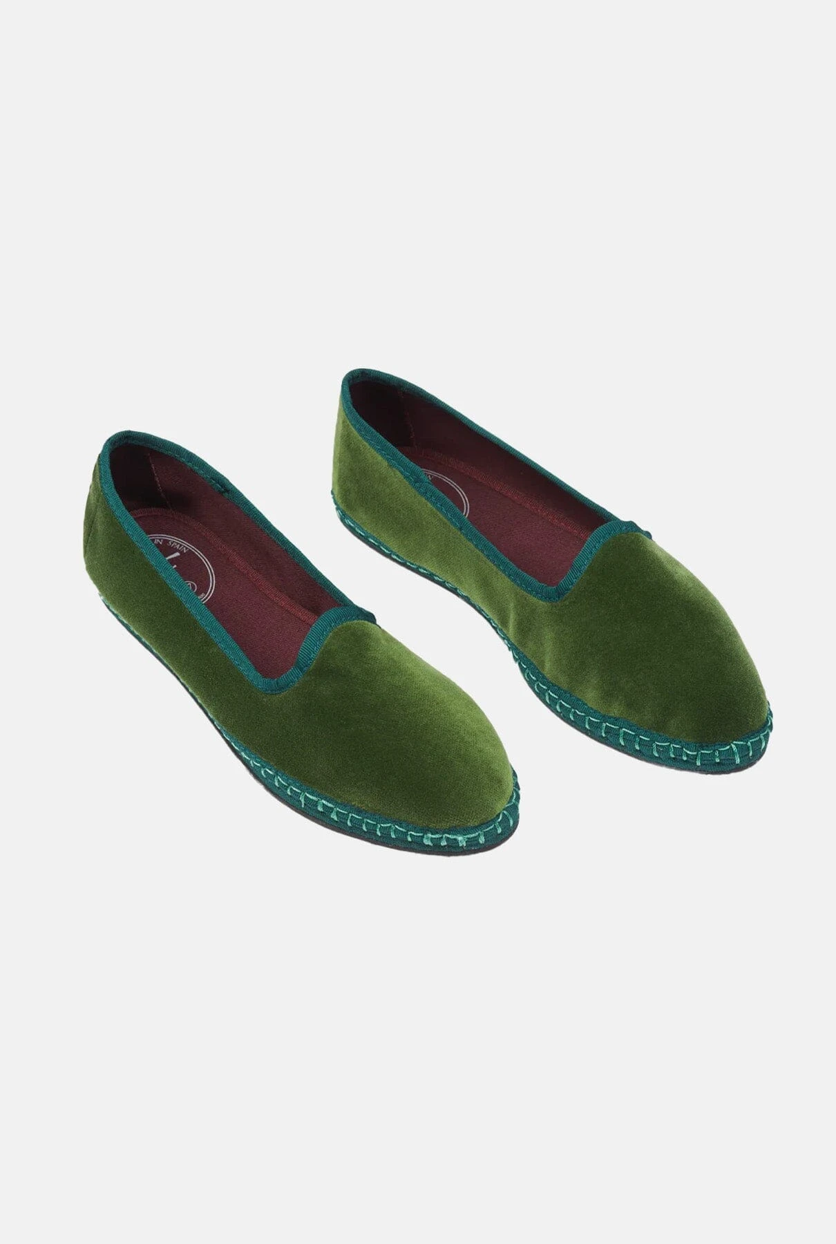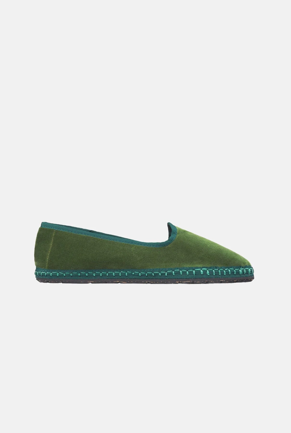Green velvet slipper with dark green contrast piping. The outside of the shoe is 100% cotton velvet, and the inside of the shoe is 100% ecological cotton with anti-bacterial treatment. The sole is made of rubber produced from recycled bicycle tyres.