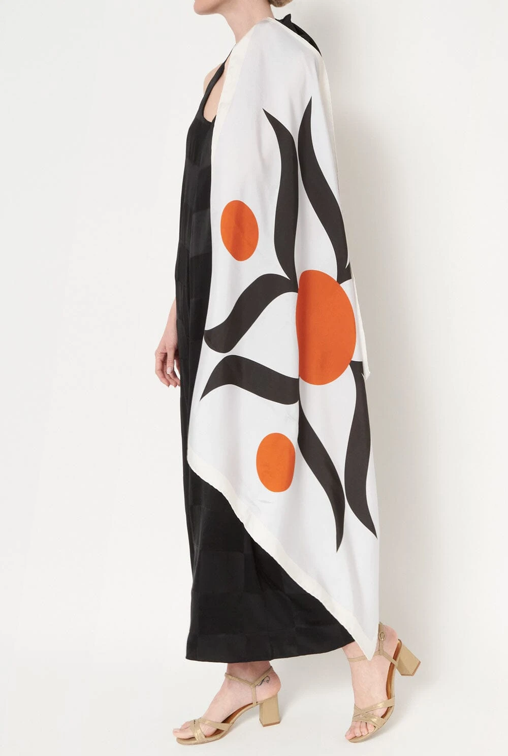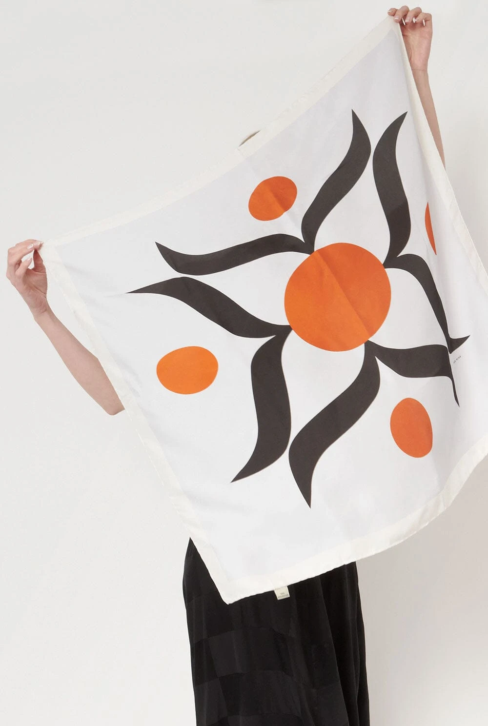Limited Edition designed by Carrie Van Hise. Oversize square silk scarf printed with abstract olive leaf design. The Olive scarf can be worn around the neck, as a head scarf, or around the waist. Made in Spain.