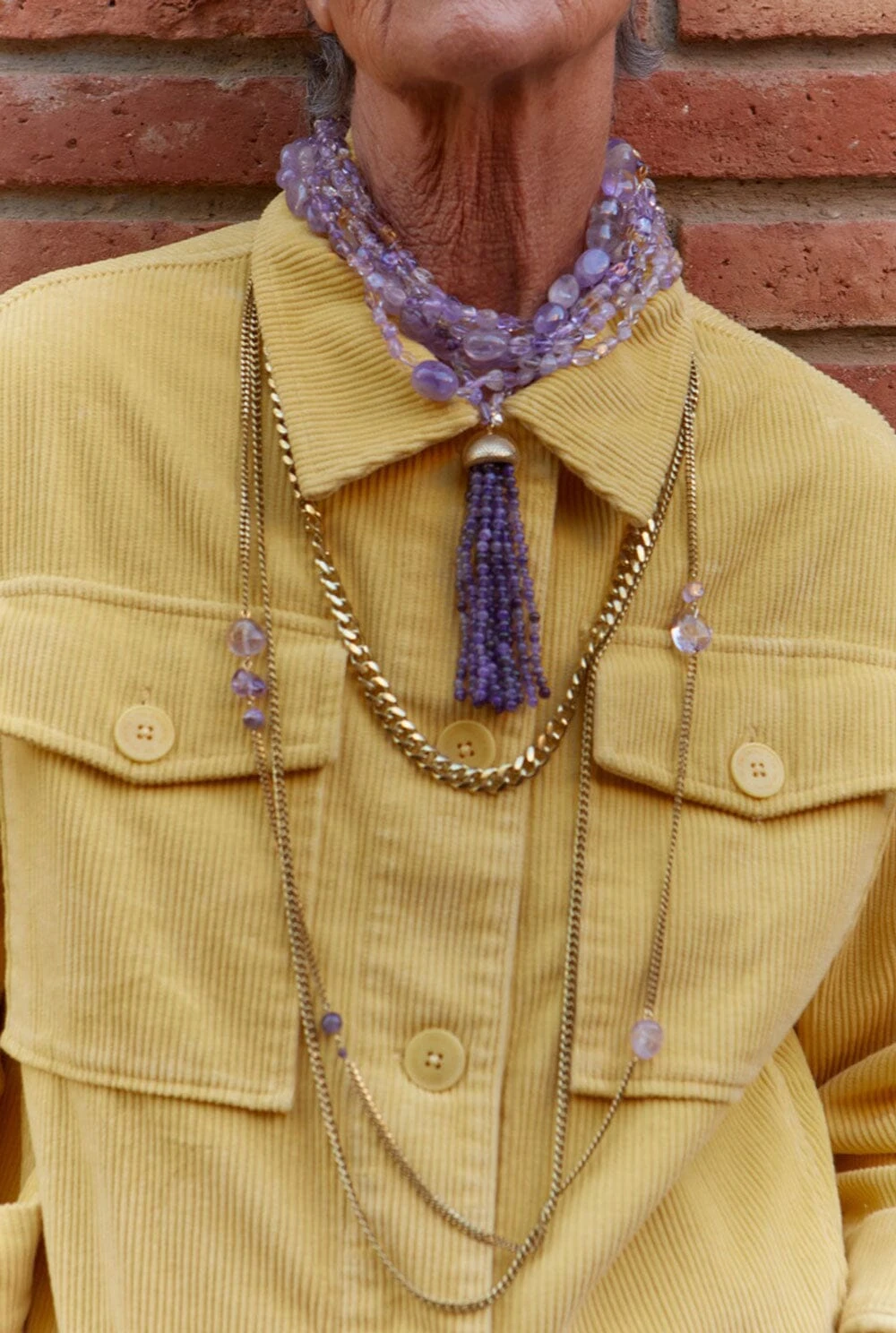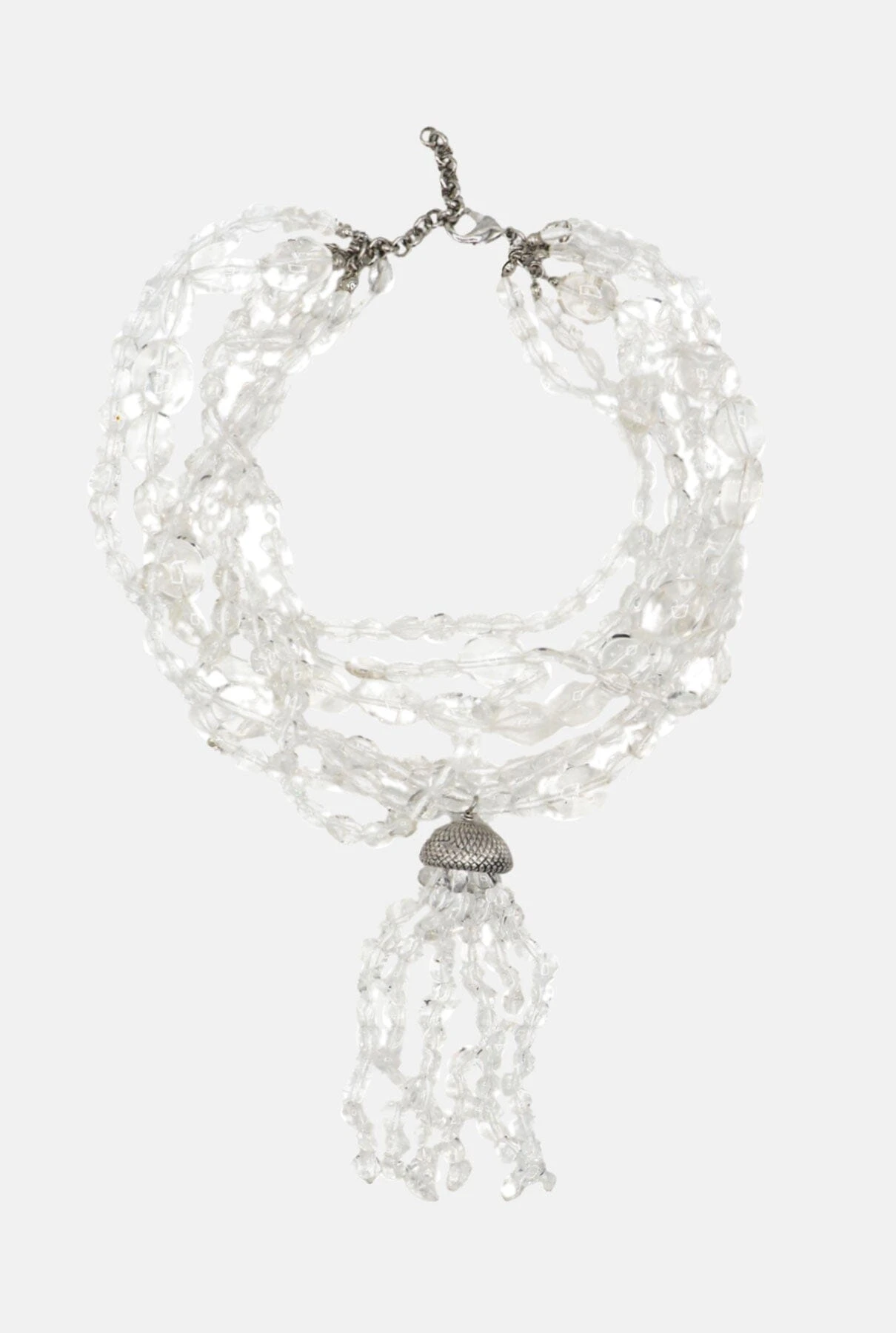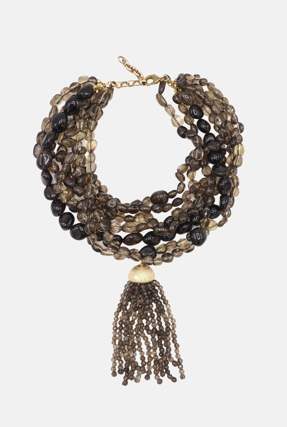 XL bib necklace made with natural stone strips and a fringe pendant.
