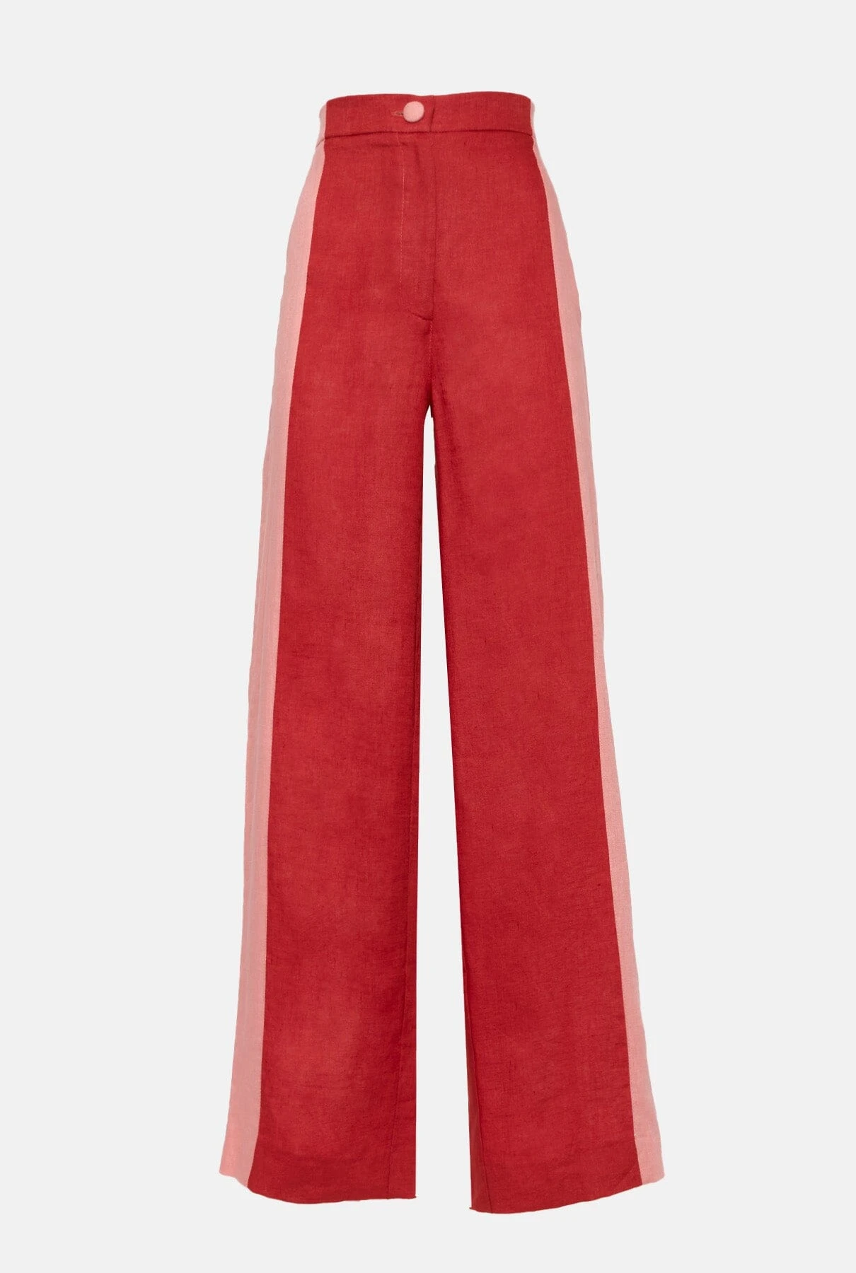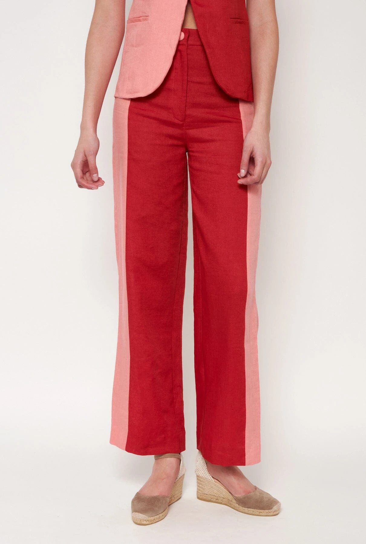 Handmade trousers in our workshop in Lanzarote. Pantalón fluido de tiro alto bicolor. Pierna recta. Front zip and summary fastening.