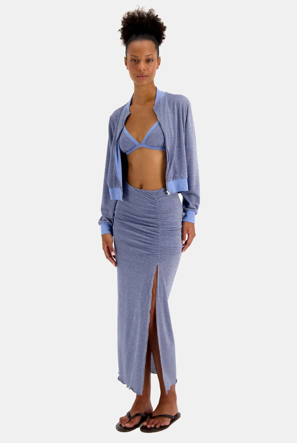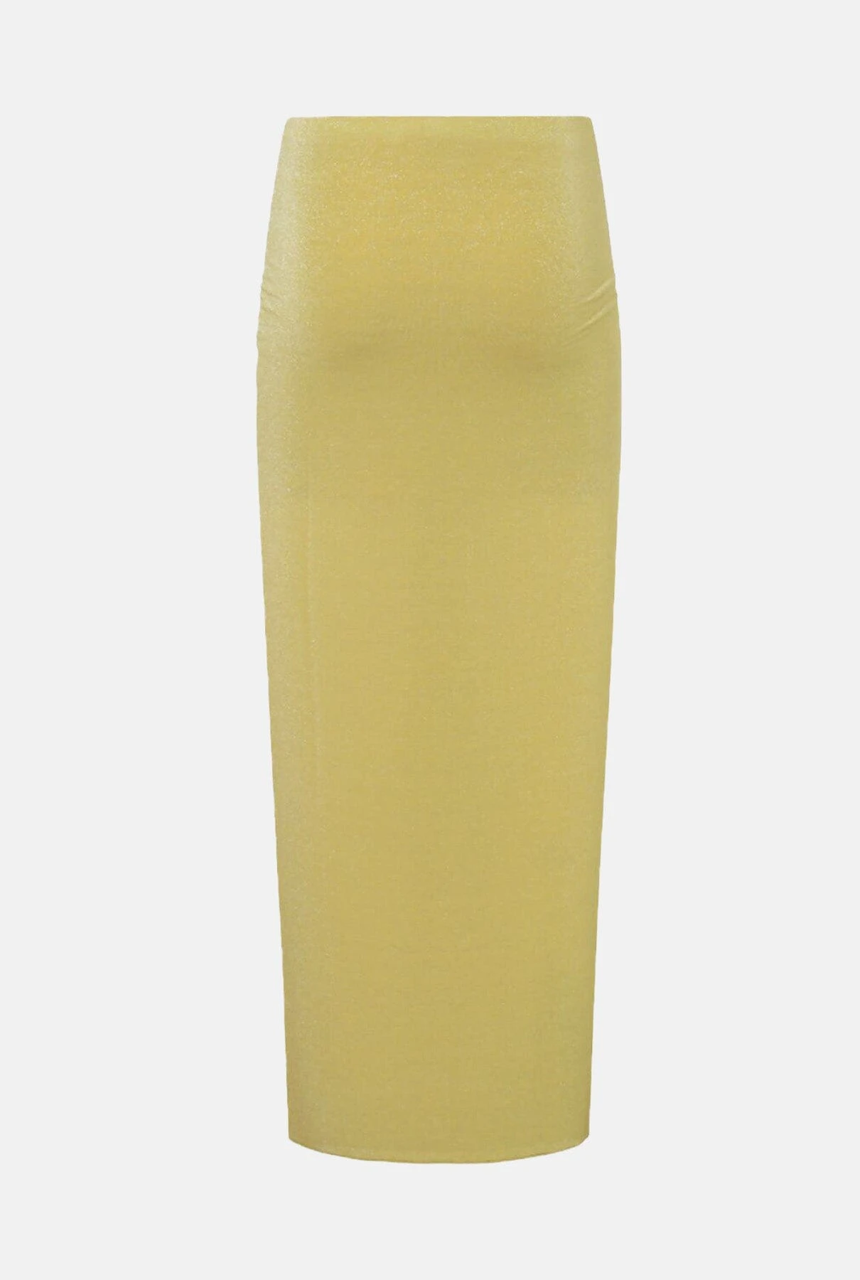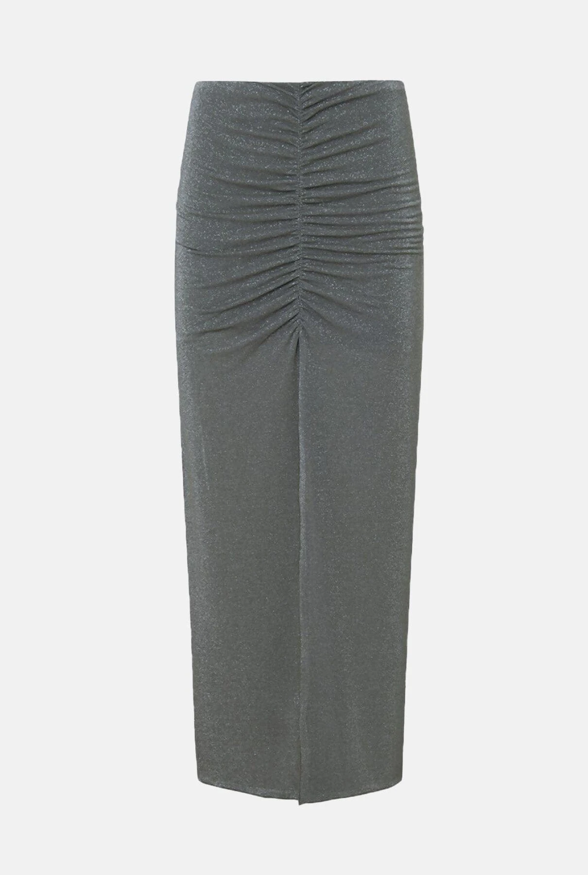 Elastic lurex knit sarong skirt, with elastic waistband, long to the ankles, gathered and side slit.