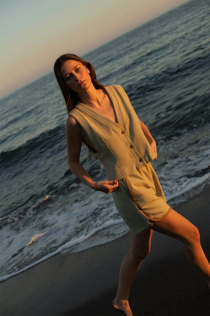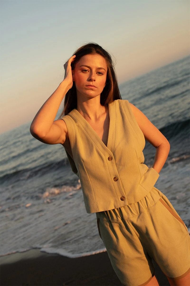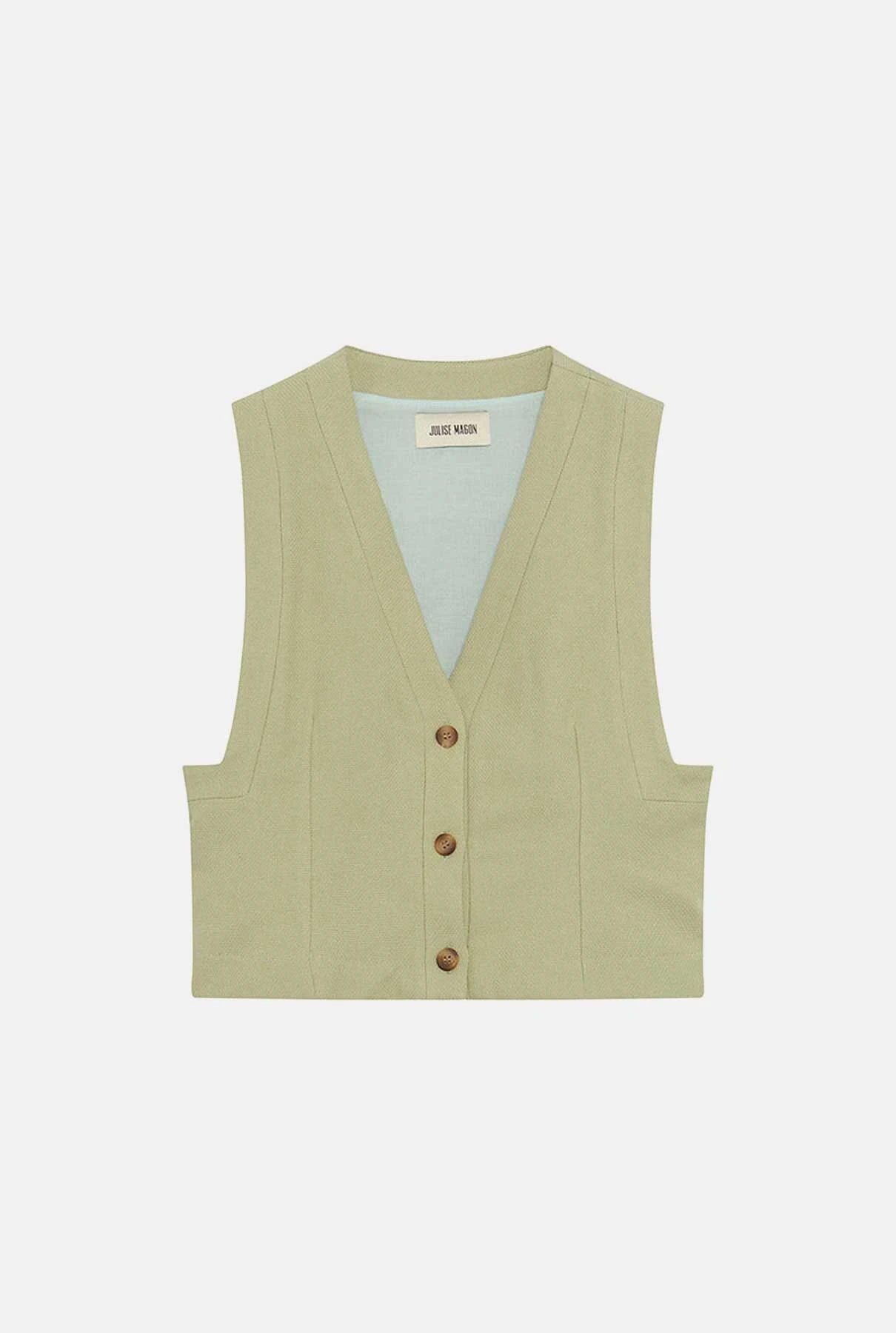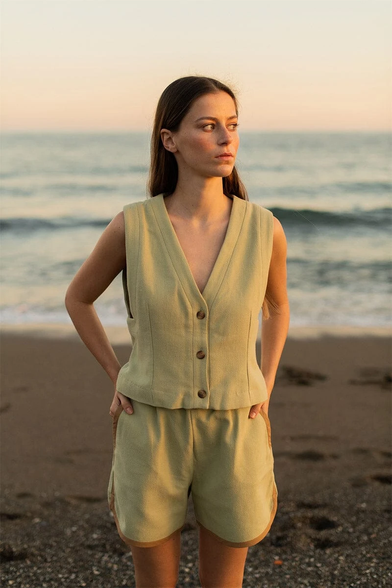 Light green fitted waistcoat in canvas. Square armhole sleeves and front summary fastening. For a complete look, can be combined with Julia jacket and Katty shorts. In 100% organic cotton. Designed by Julise Magon.
