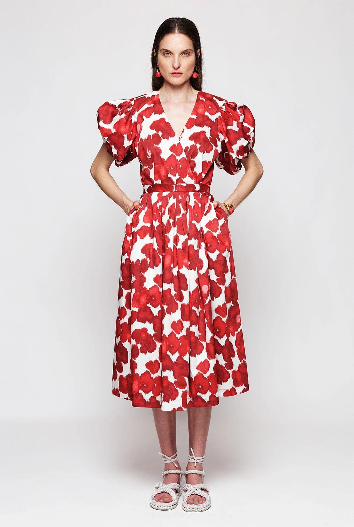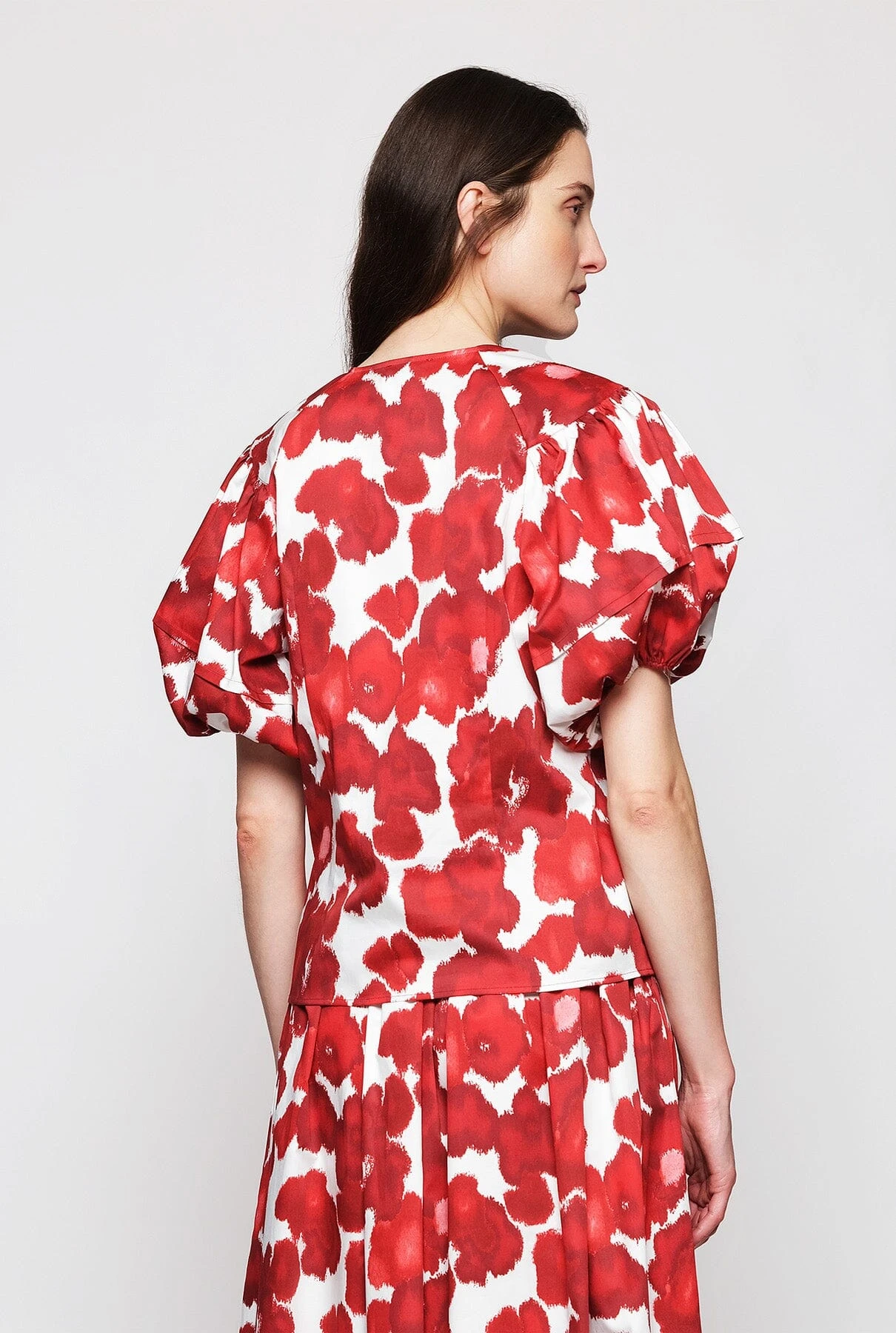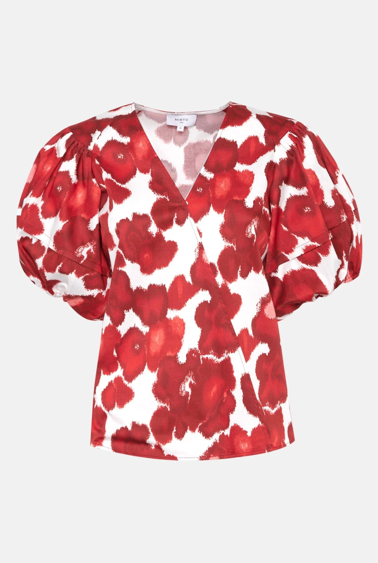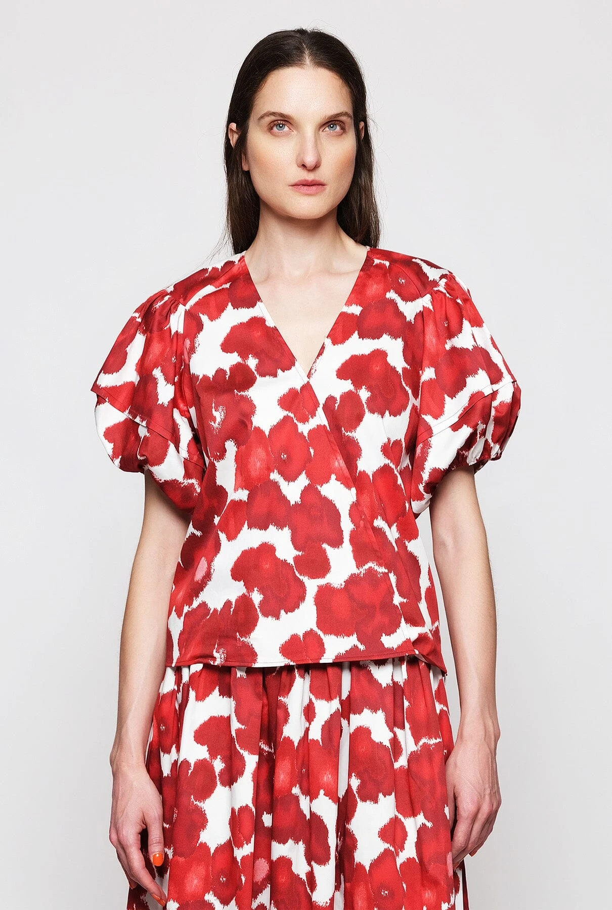 Stretch cotton top printed with watercolor brush strokes. Open crossover neckline with hidden press stud. Short puffed sleeves. Side invisible zipper.