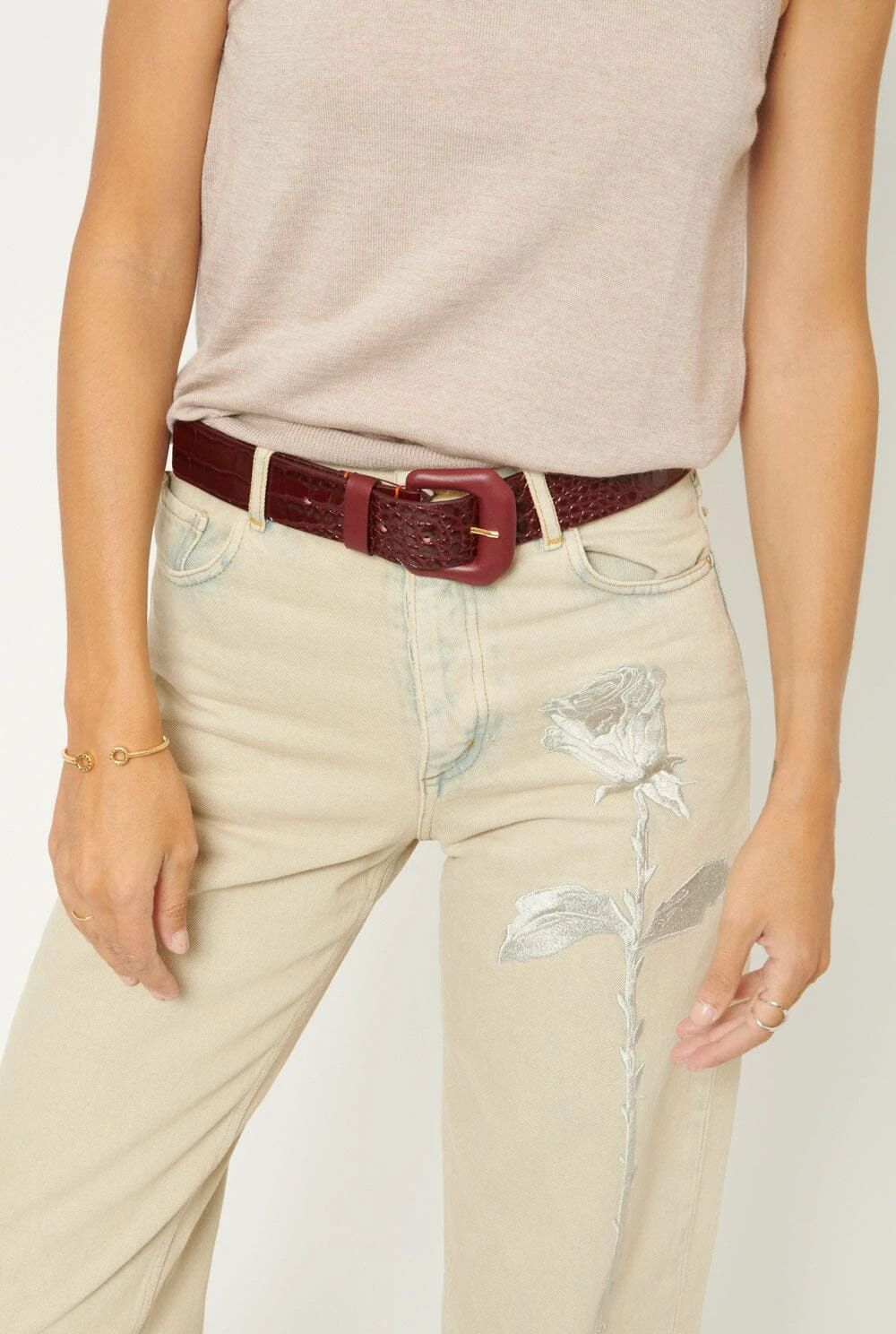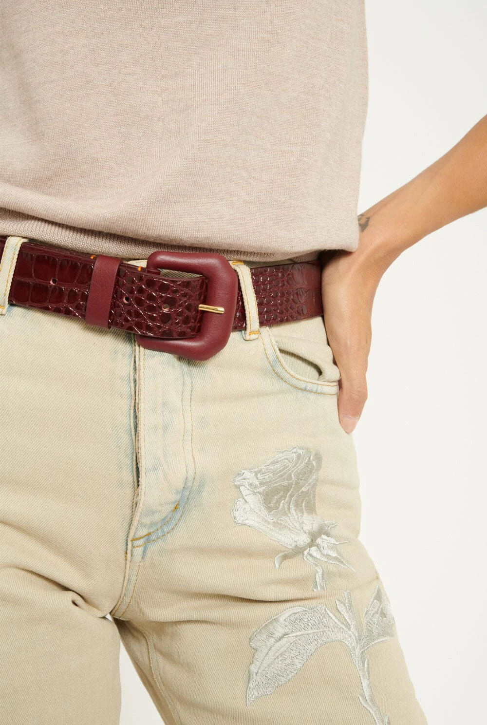 Natural leather with croco pattern engraved treated in Spain with buckle covered in leather.