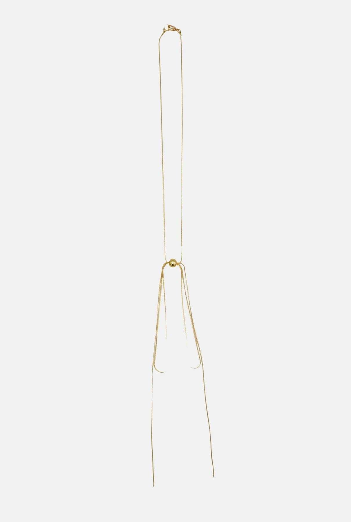 Tie type necklace, made with a thin chain joined in the center that creates a loop effect.