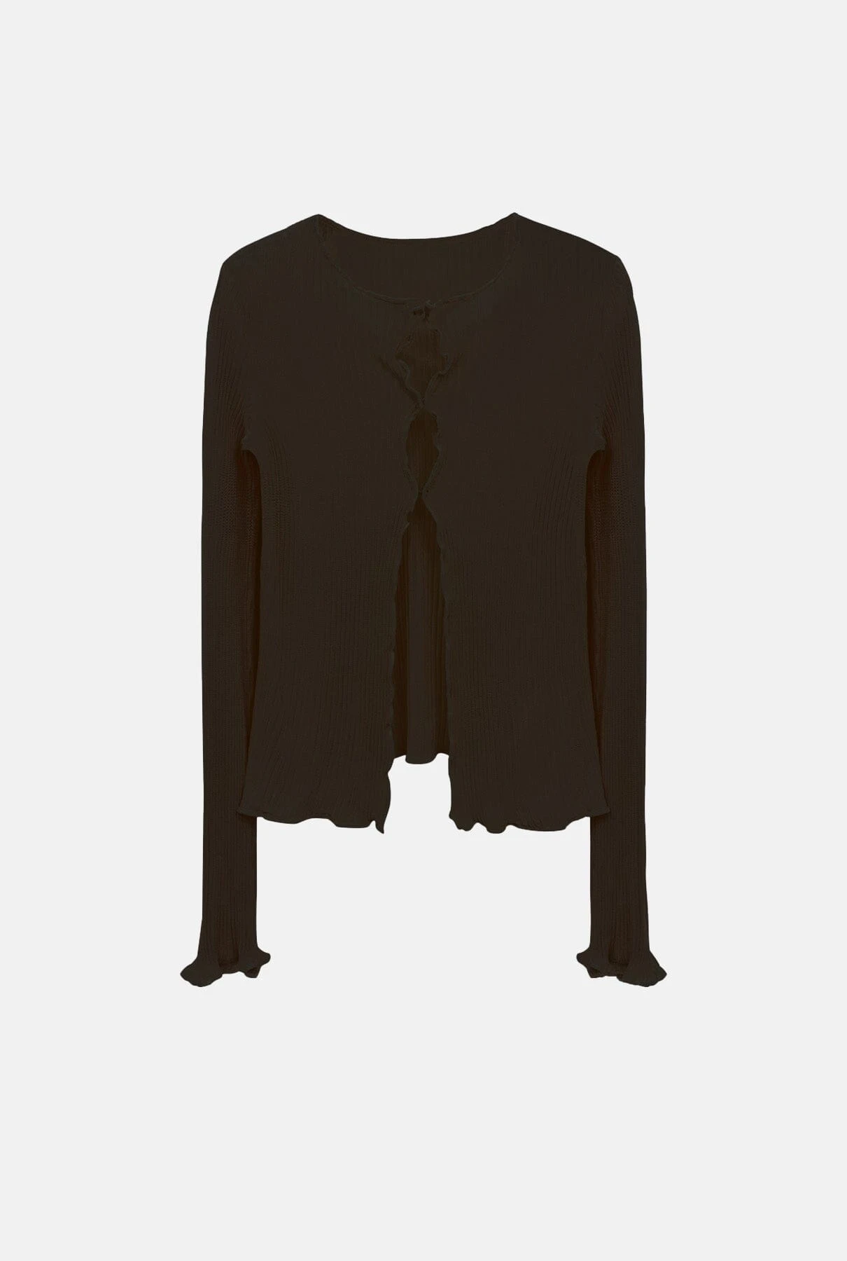 Fine cardigan with long sleeves. Three small hooks for the front fastening. Extra light.