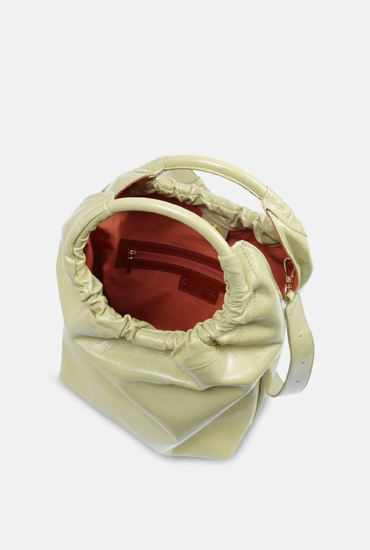 Medium cowhide leather bag. Short handle to carry by hand and removable adjustable handle to carry on shoulder or shoulder strap. Inside zip pocket. It closes with automatic interior. Organic cotton lining.