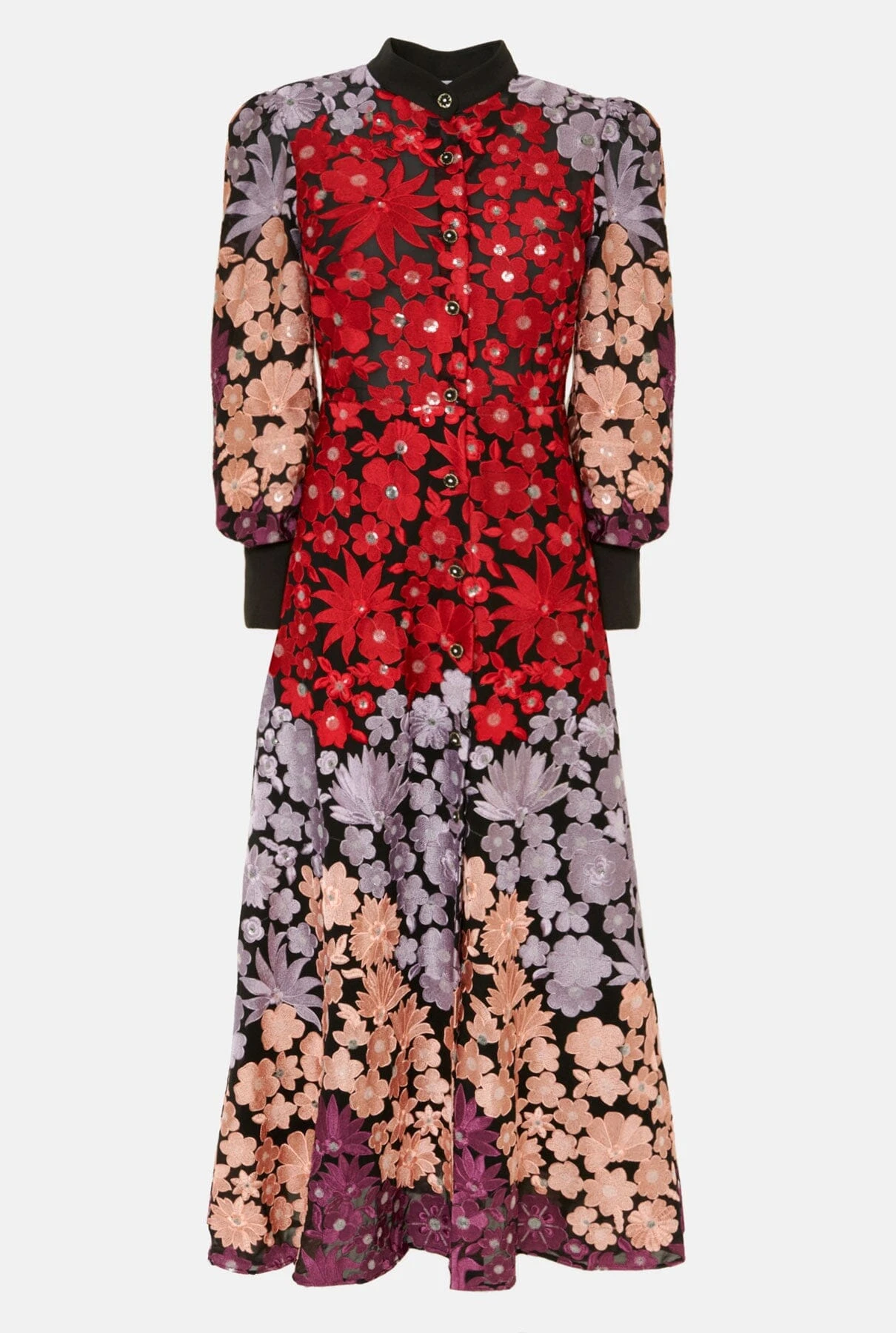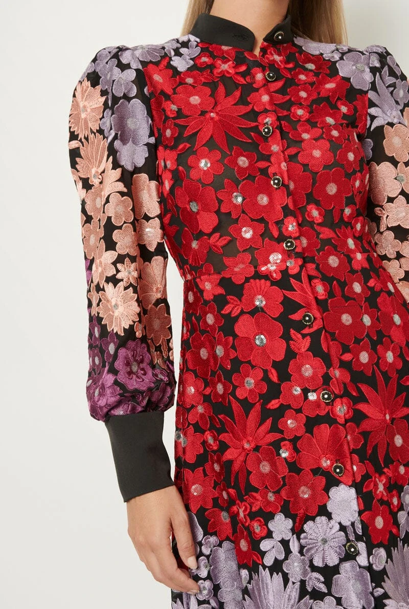 This L.D. design is made in black floral embroidey print theads in four colours that will no leave you indifferent. Ii is a feminine and versatile model that will make you feel special. Mao collar and longsleeve desing finished in cuff. Front closure with jewell summarys and tie belt in contrast. Lined