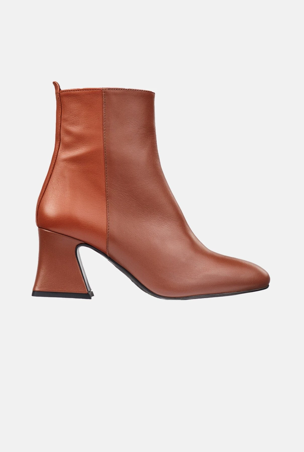 Two-tone brown leather ankle boot with zipper and personalized leather puller. Heels are 6cm high. Breathable fabric lining and leather insole. The outside of the shoe is 100% leather, and the inside shoe is made of leather. The sole is made of rubber produced with recycled coffee capsules.