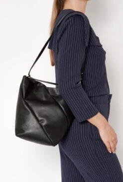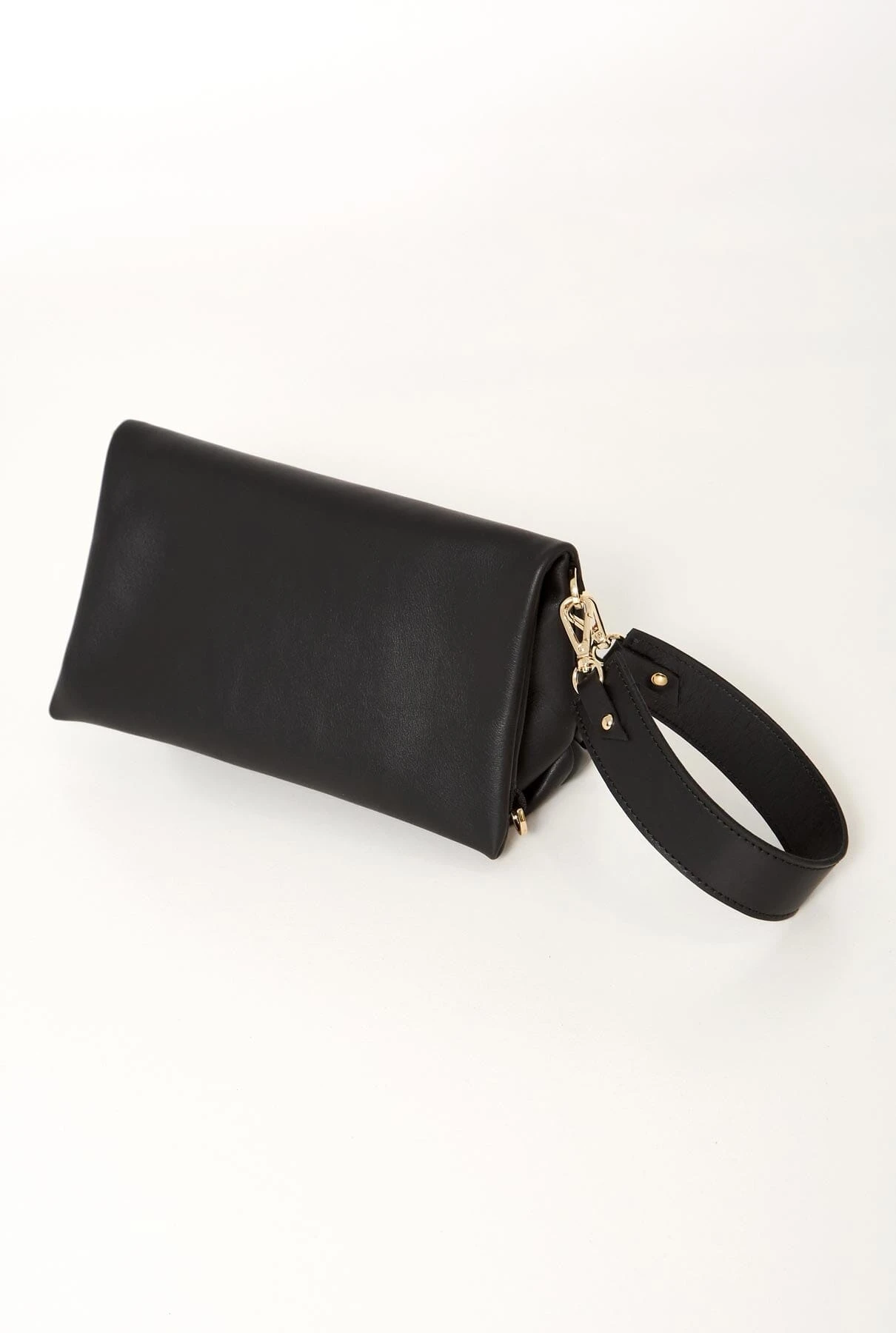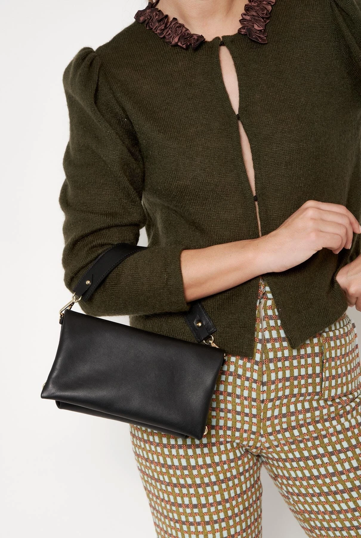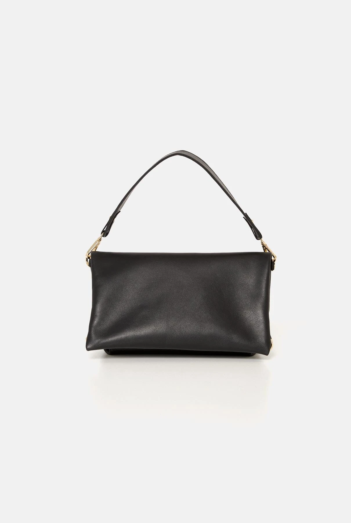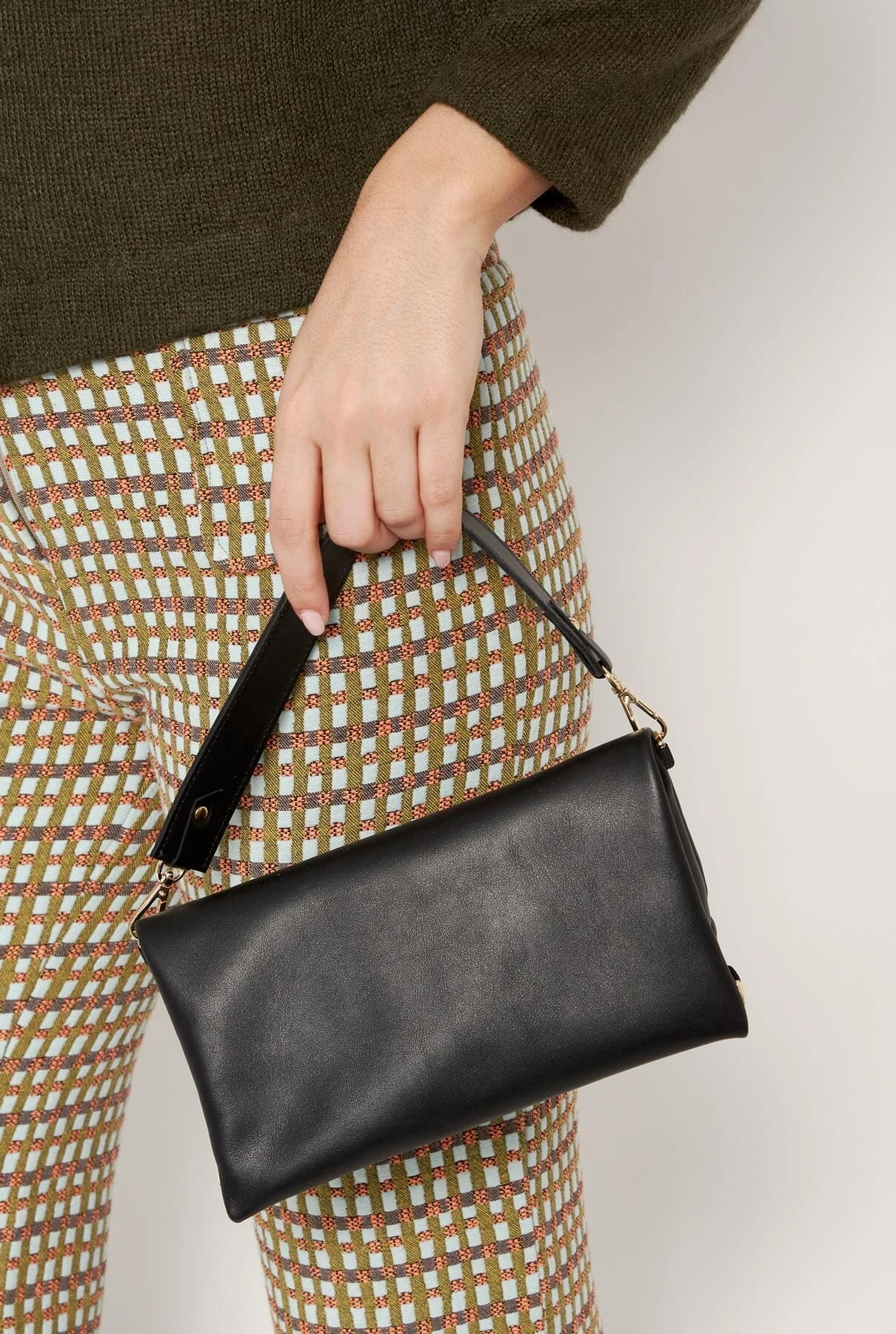 Handbag with flap and handle made of cowhide leather. Zip fastening and inner textile pocket. Possibility to carry it open in the high position.
