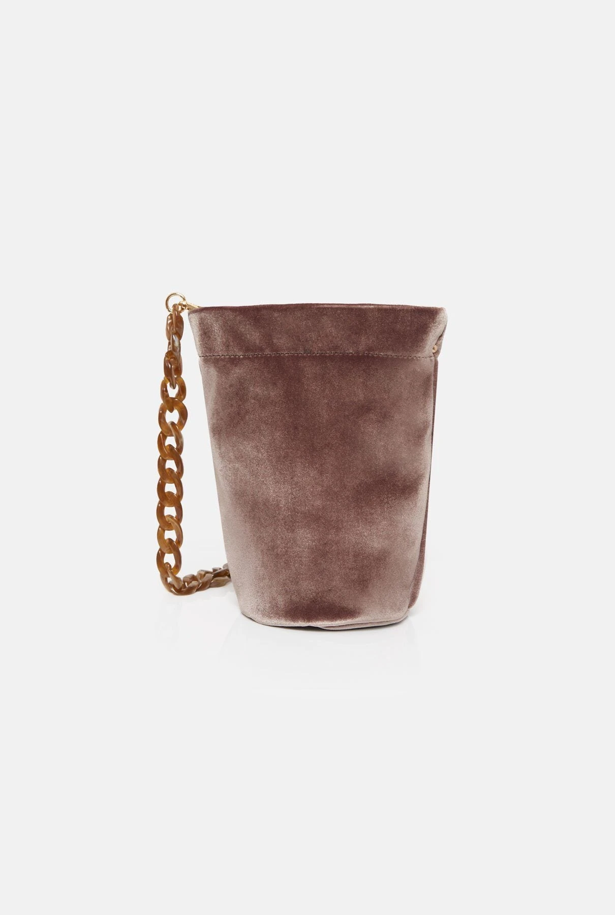Handcrafted soft bag made with Velvet. Inside pocket and snap closure. Detachable resine matching color chain with 2 hooks. Designed by The Bag Lab.