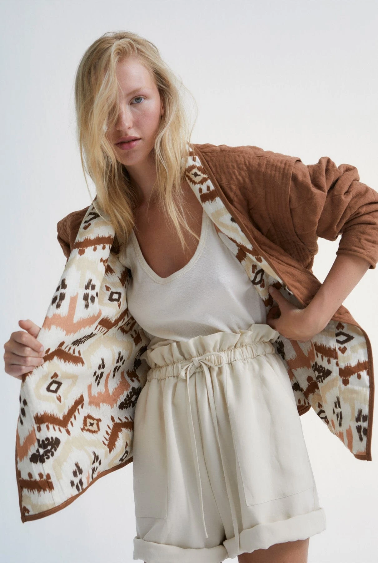 Elevate your versatility with the West Reversible Jacket, a 100% linen piece, quilted for warmth and comfort. It features side pockets and an exclusive print on both sides. Make a statement effortlessly with this chic and reversible jacket, perfect for any occasion.