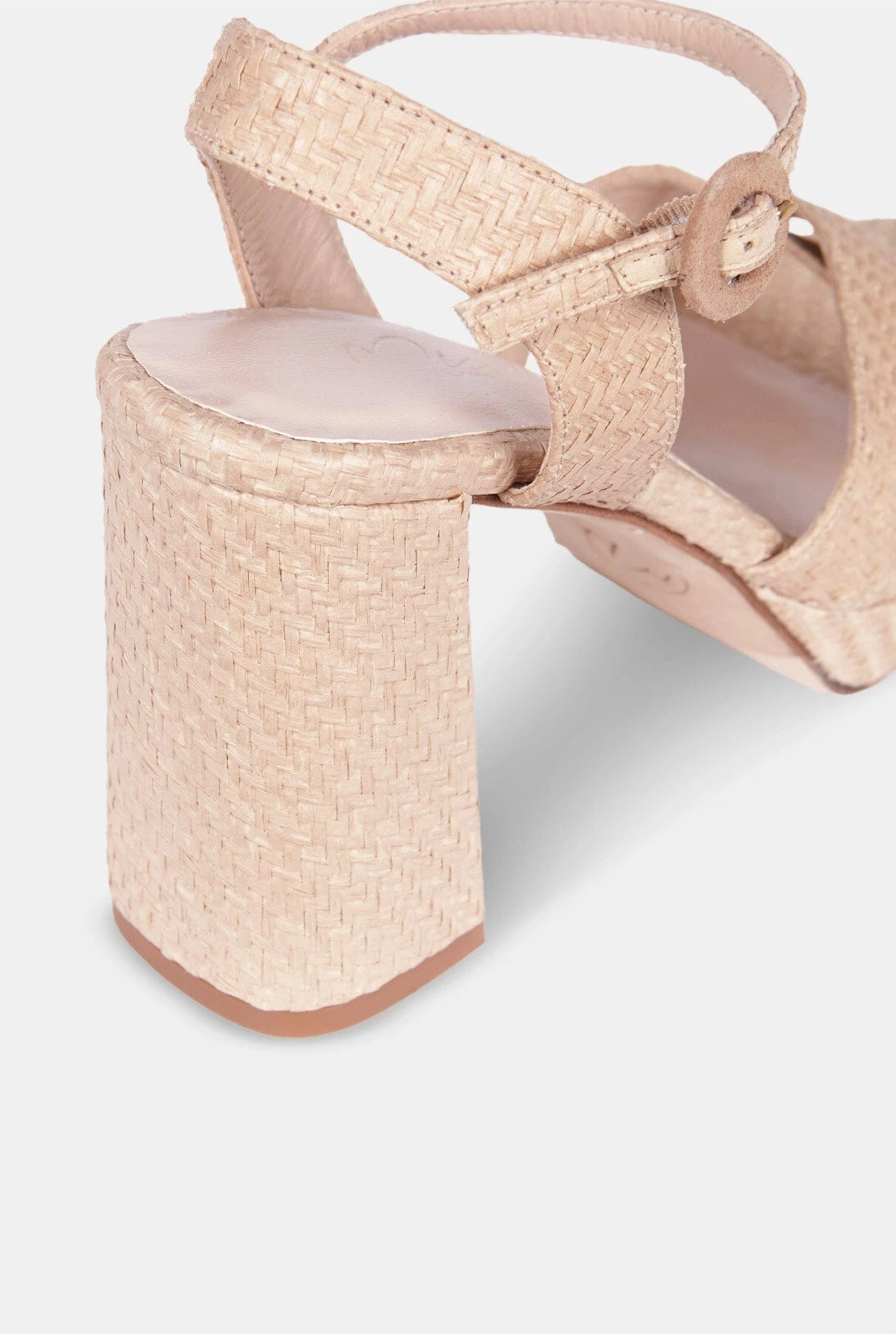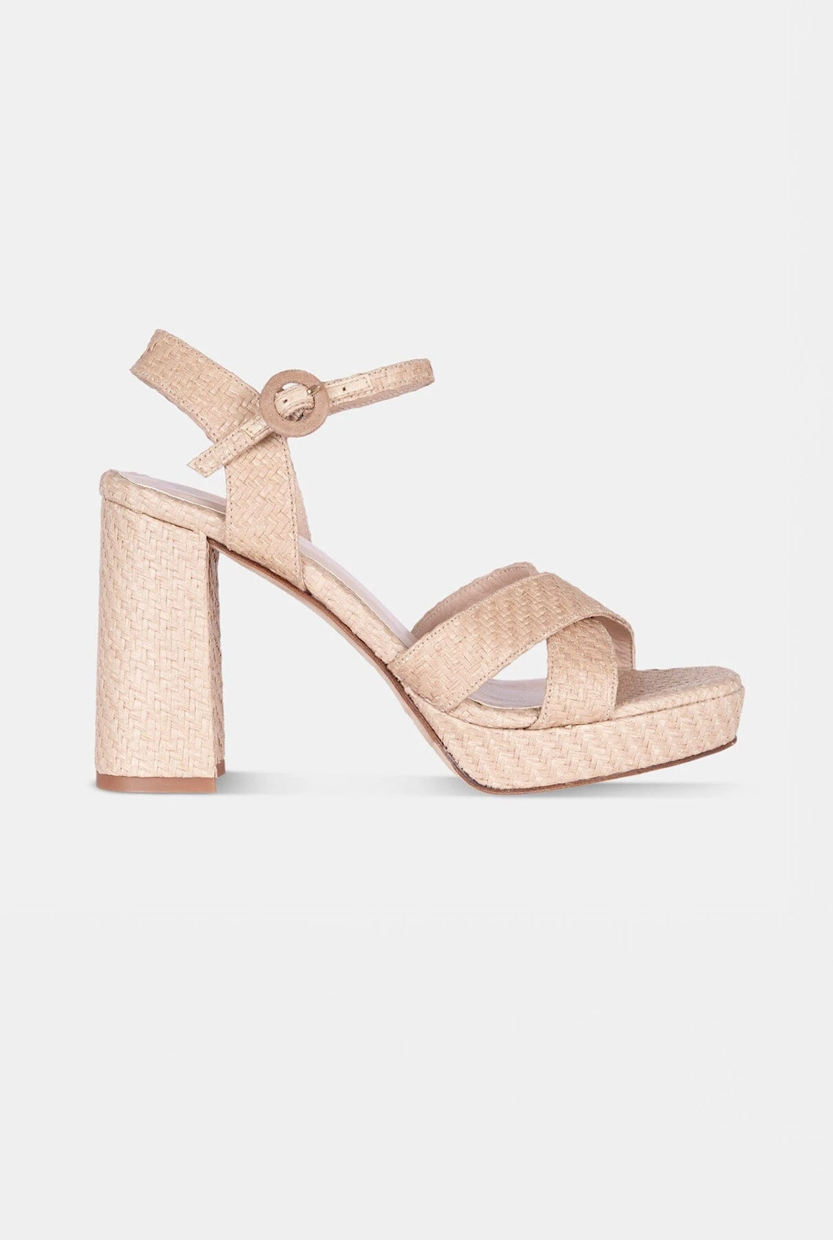 Heeled sandals with platform and square sole. Rustic and handcrafted style heeled sandals lined in raffia.