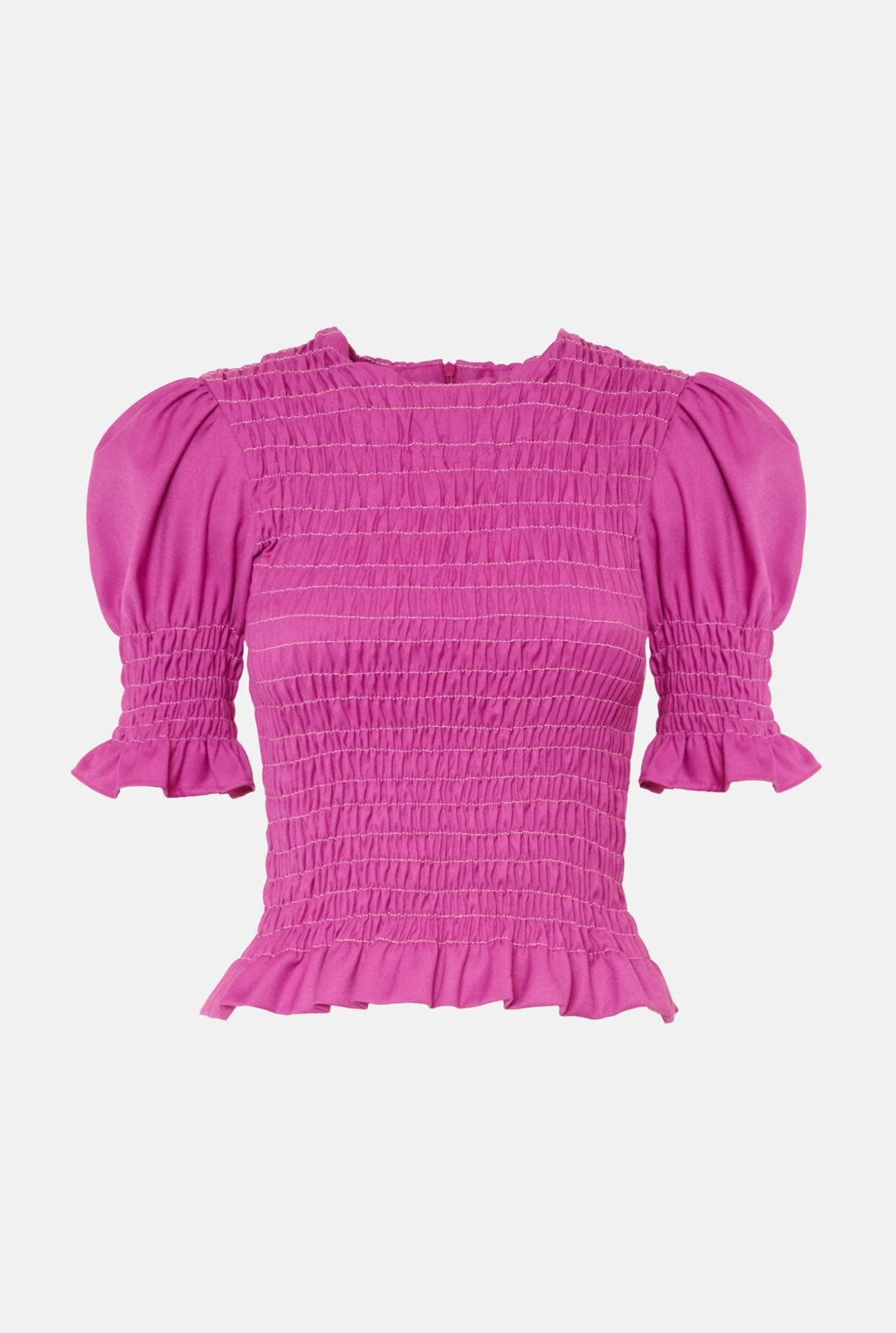 Short-sleeved top in a bougainvilla color with a gathered bodice with contrasting thread that adapts to different body types. Short sleeves with small gathers and back closure with invisible zipper. Wash at 30 degrees, iron at low temperature or with a tissue on it, do not tumble dry, do not dry clean and do not use bleach