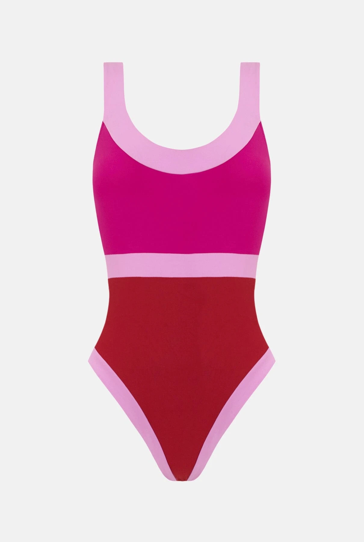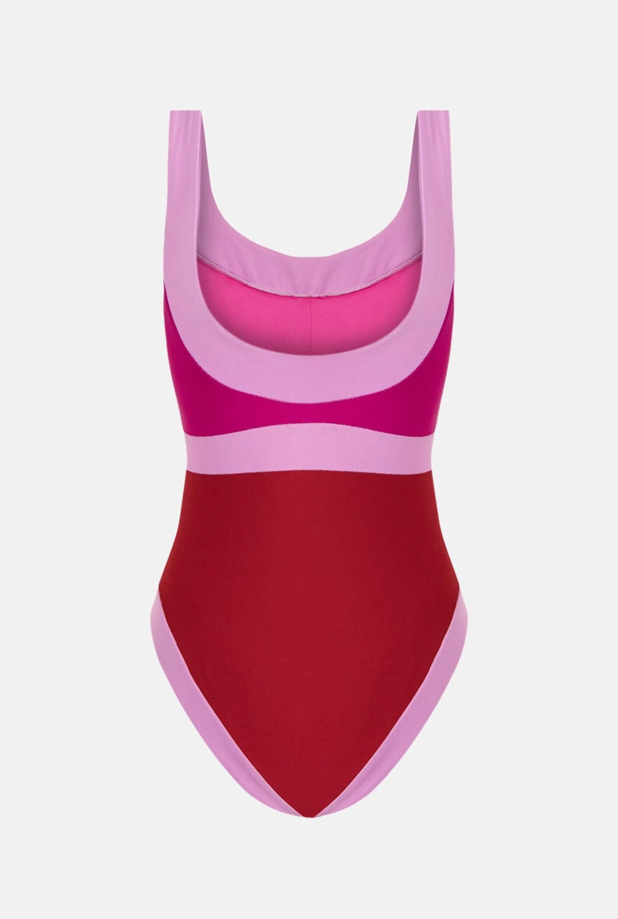 This swimsuit combines style and elegance with a purple inner lining that contrasts with the main design. It incorporates removable cups, adapting to your preferences. Its design with colored strip at the waist narrows the silhouette enhancing the figure and with a very original touch. High back and round neckline both in the front and back that adds a touch of sophistication and femininity.