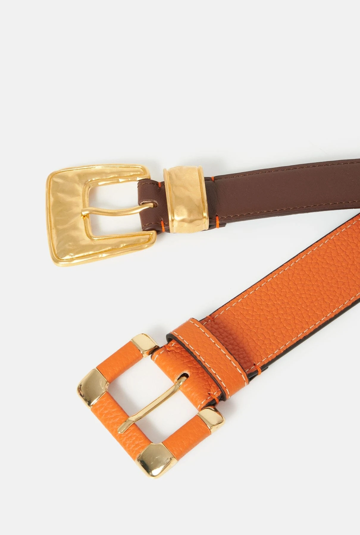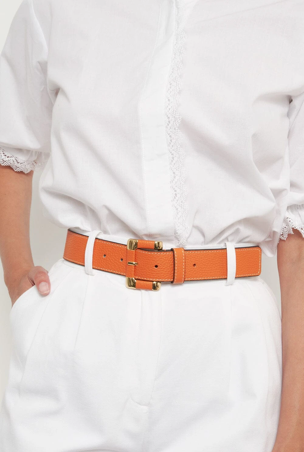 Natural grained cowhide treated in Spain with gold-plated buckle and leather-lined.