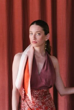 Limited Edition designed by Carrie Van Hise. Long double silk scarf printed with original color block design. The Veronica scarf can be worn around the neck, as a head scarf, or to belt a dress or jeans for a casual look. Made in Spain.
