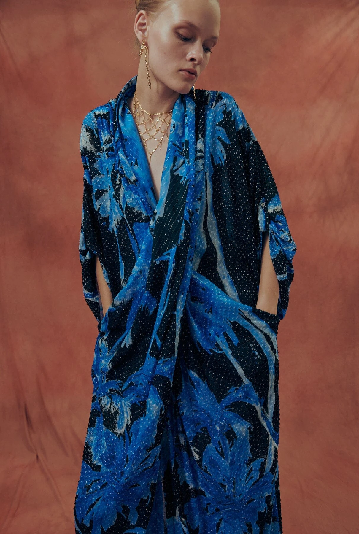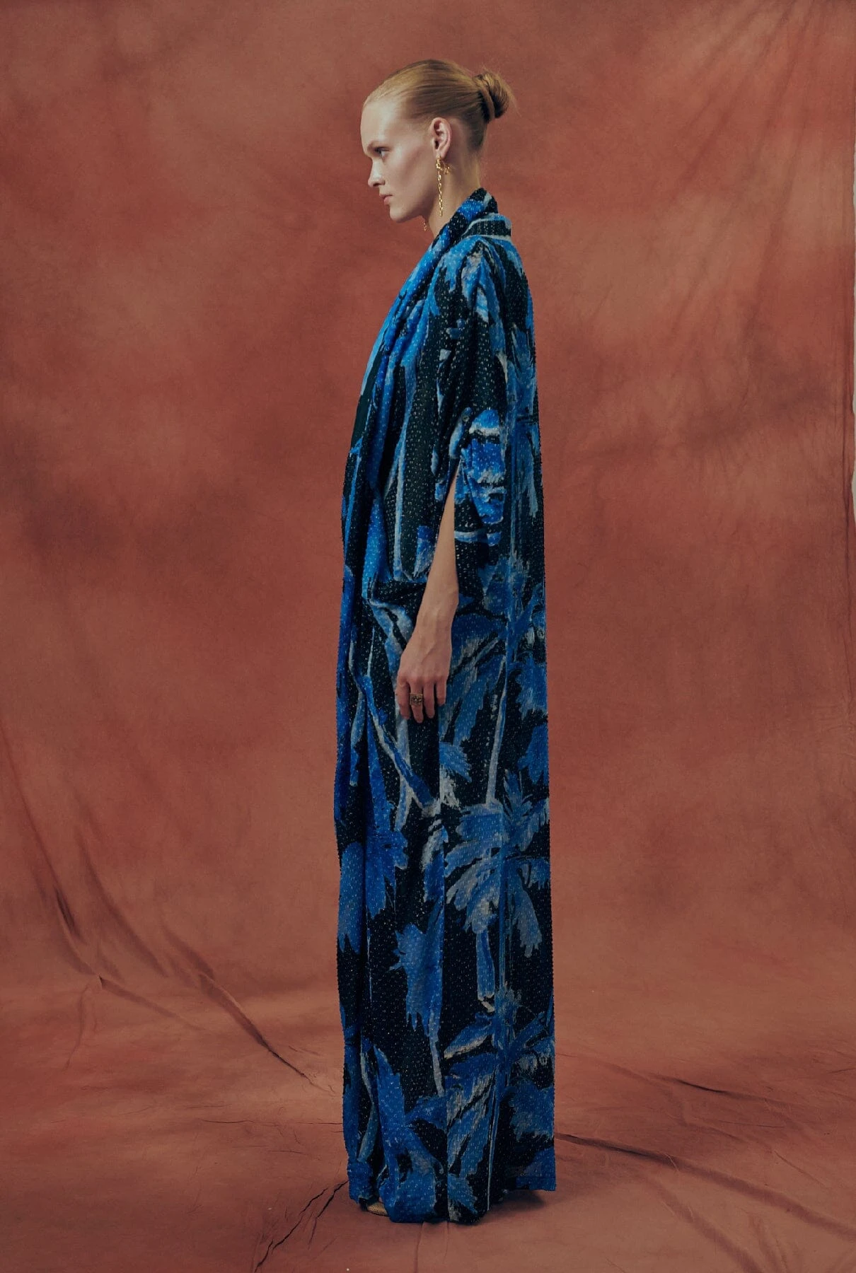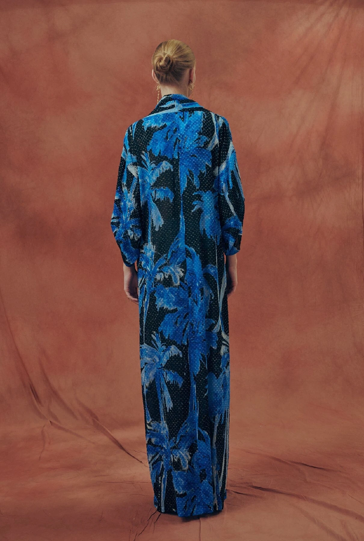 The print «La Palmeraie» is painted in tempera. In this case the material is spread on the white cardboard and with a brush filled with water the paint is spread with wrist movements, trying to connect the precision with the free flow of the paint as it mixes with the water.