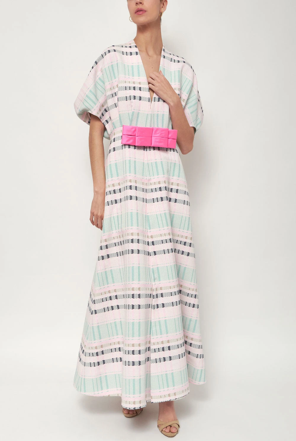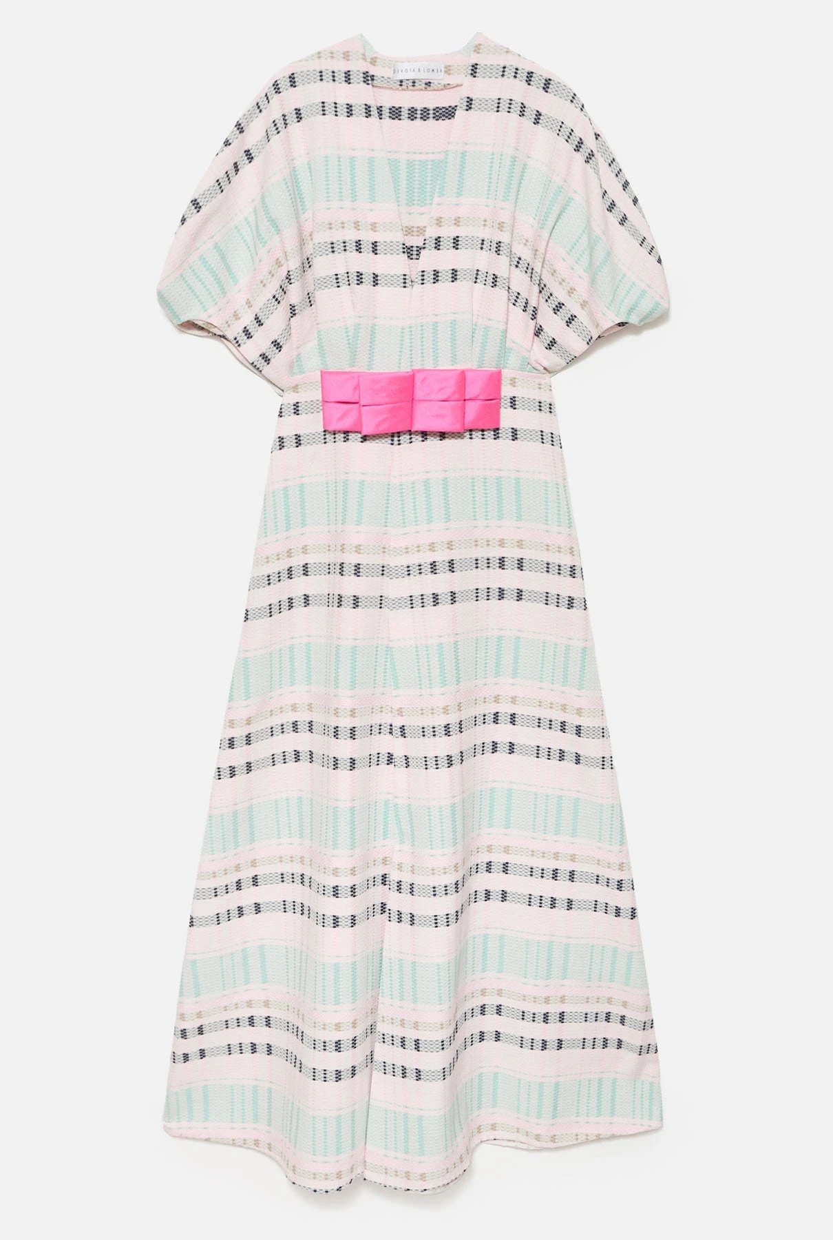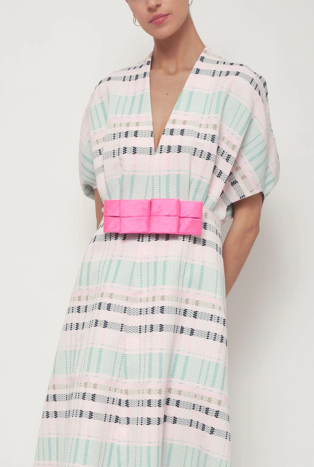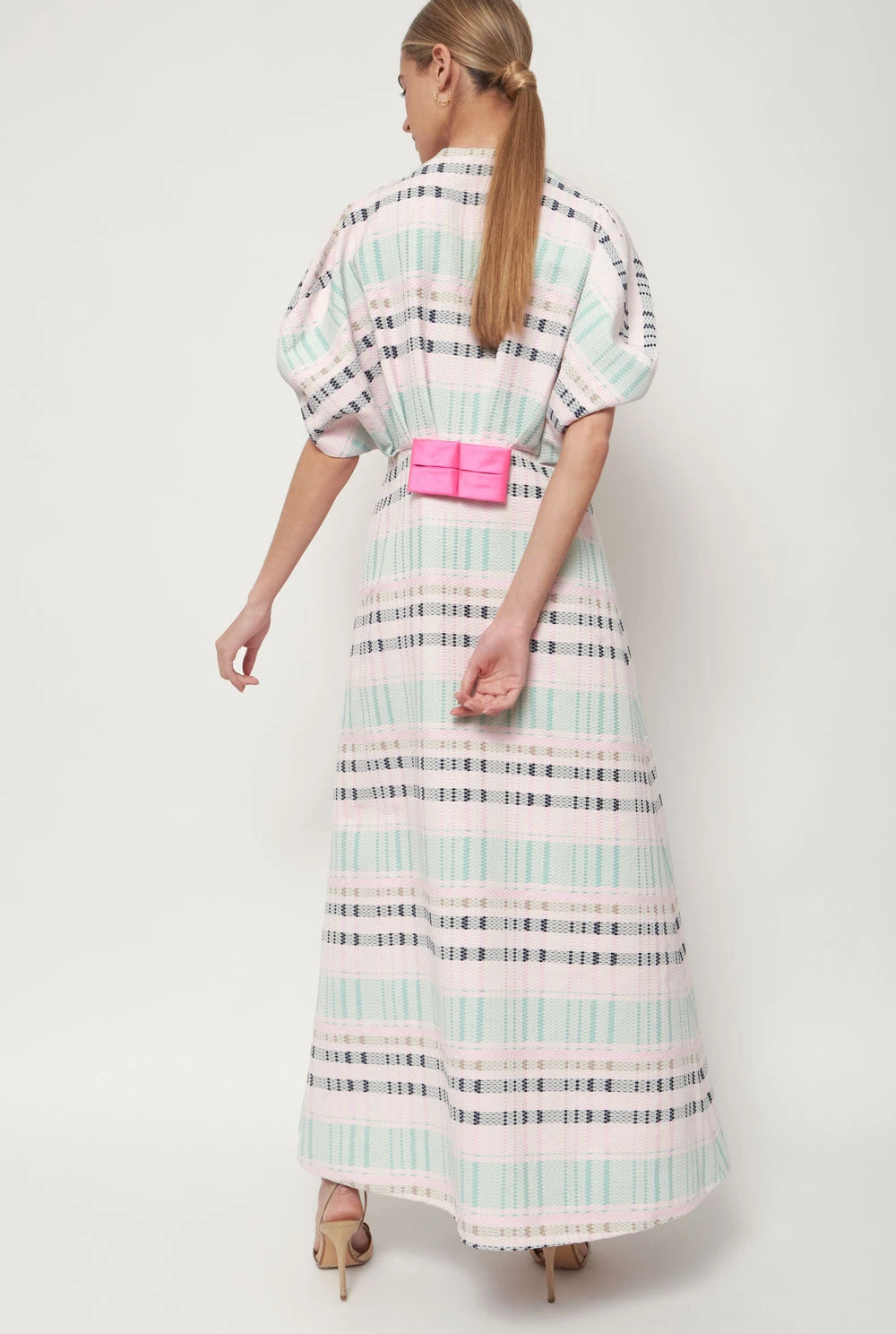 Dress in pink and blue check fabric with a bow at the front. Designed by Devota & Lomba