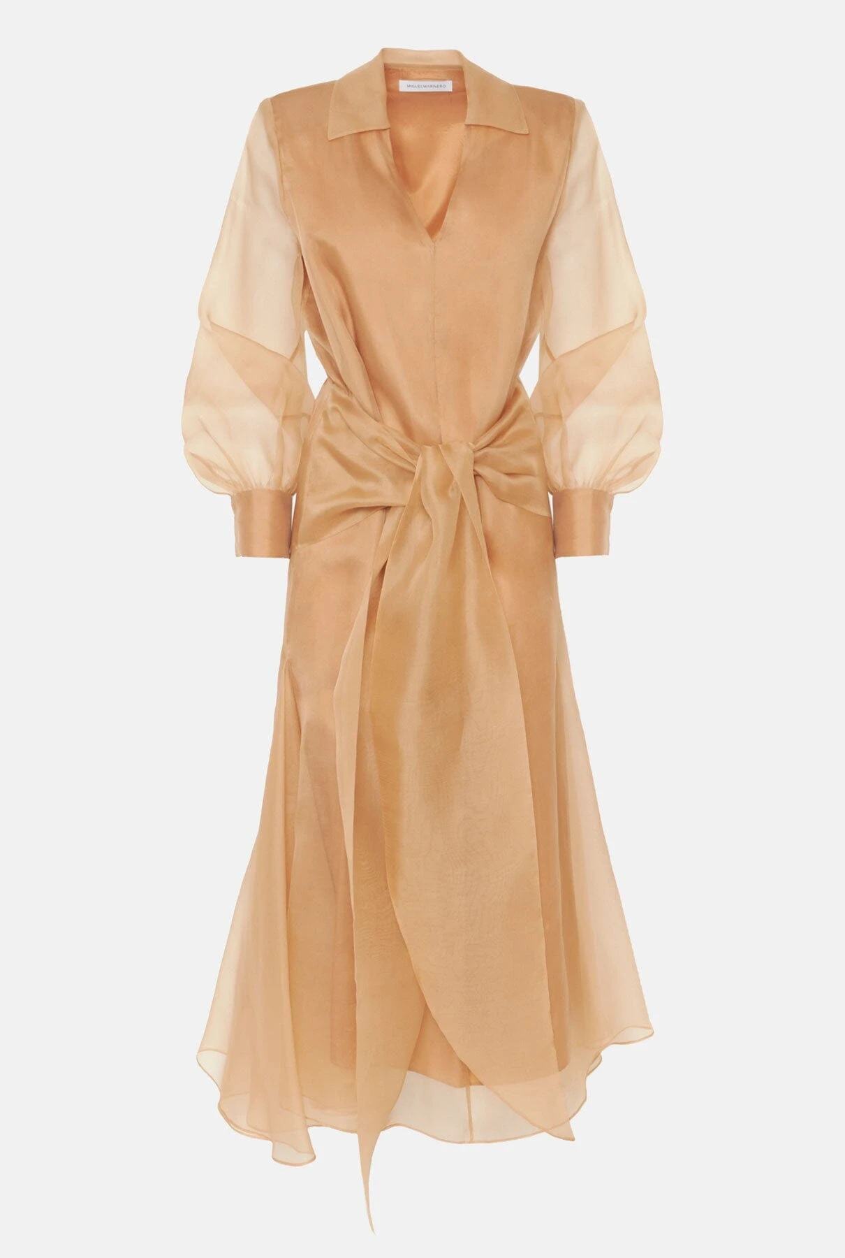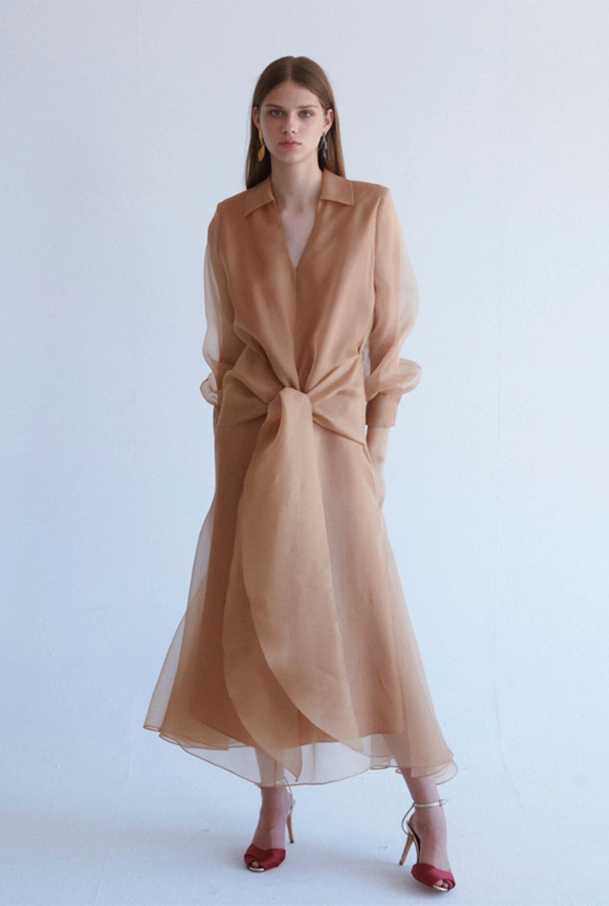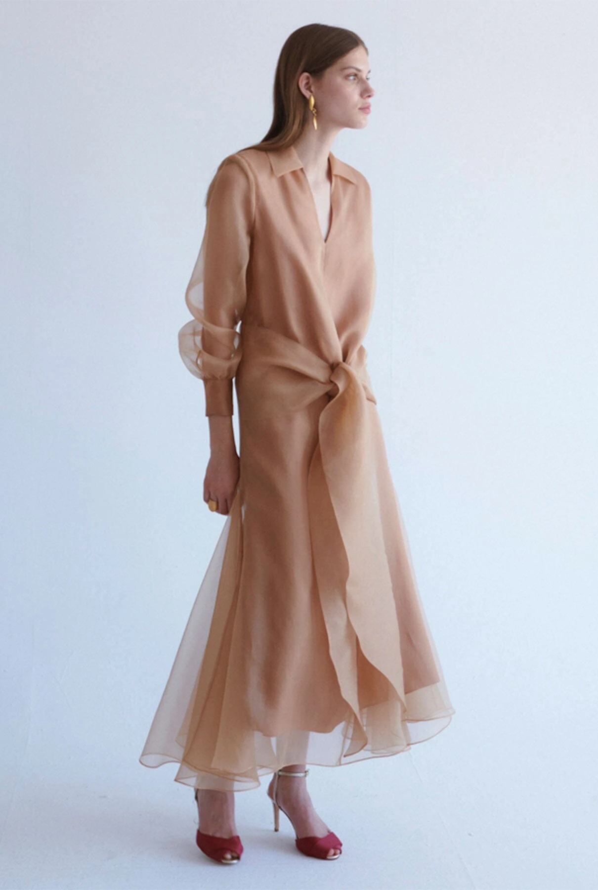 Miguel Marinero dress in light organza, a fabric that gives movement to the original shirt design, irregular midi hem and semi transparent sleeves. Sophisticated dress for guests and special occasions.