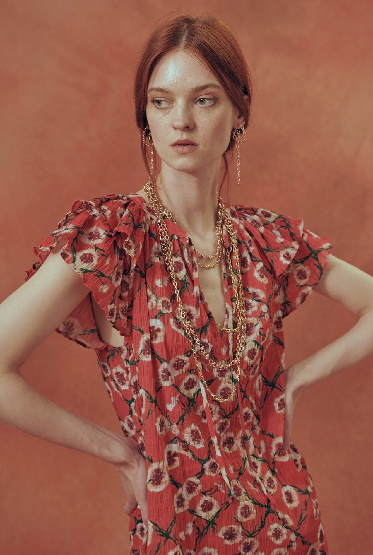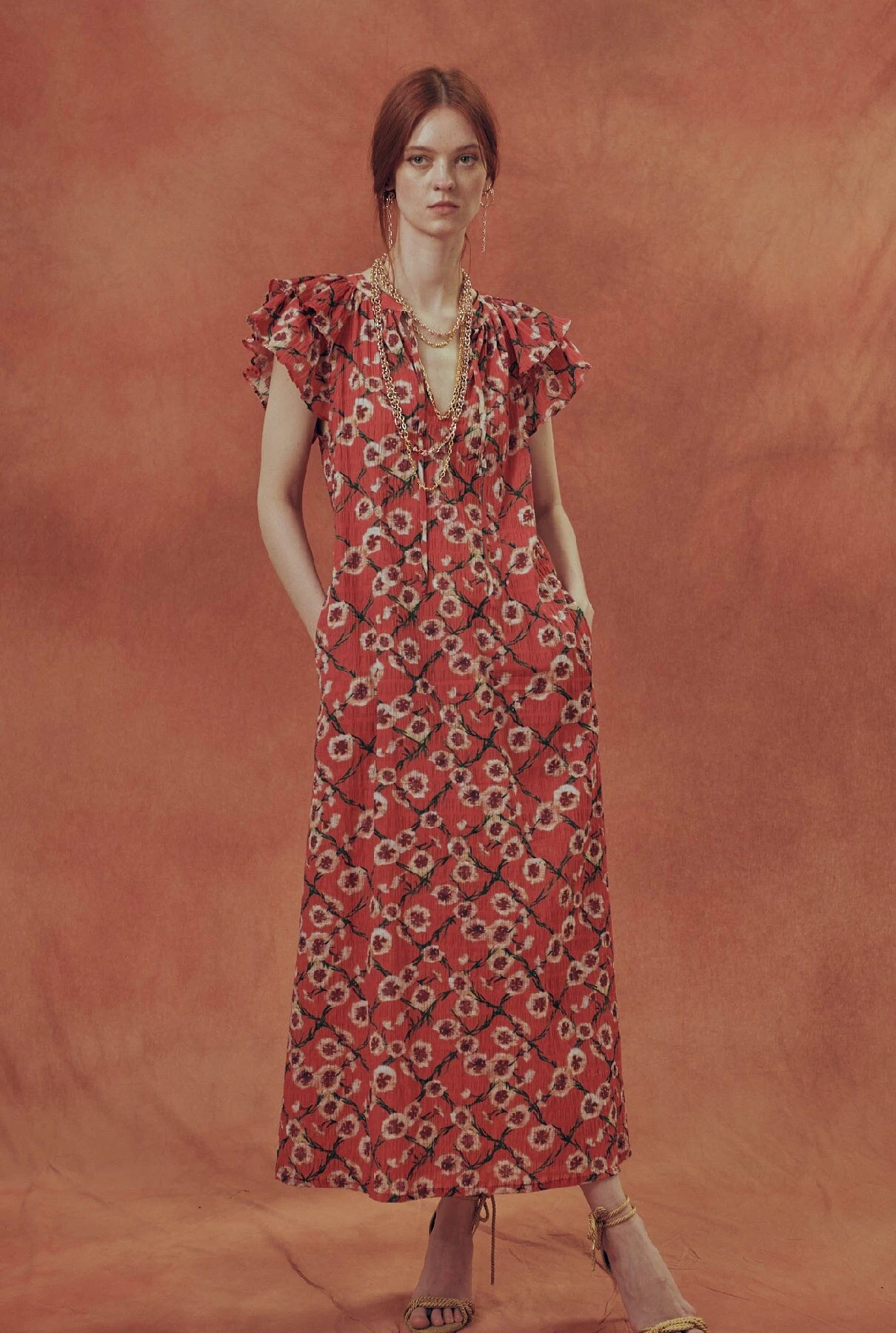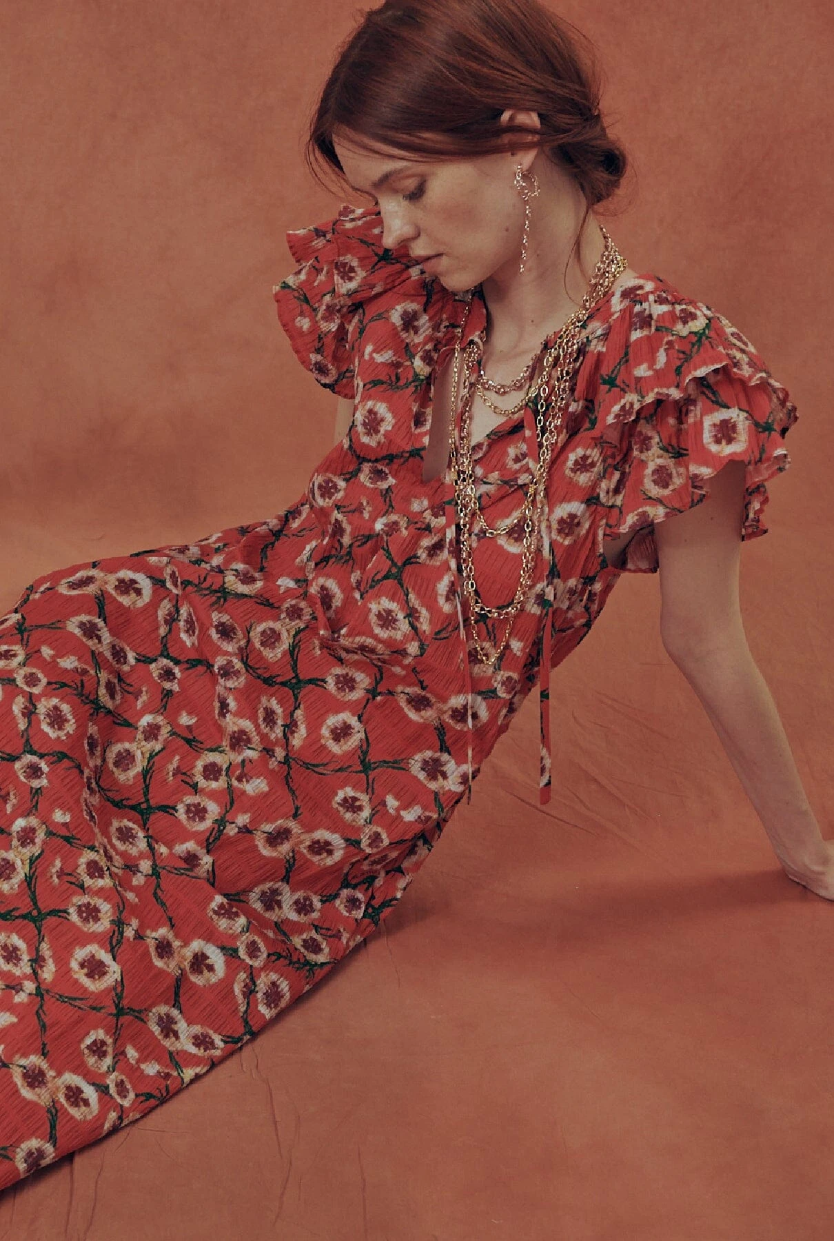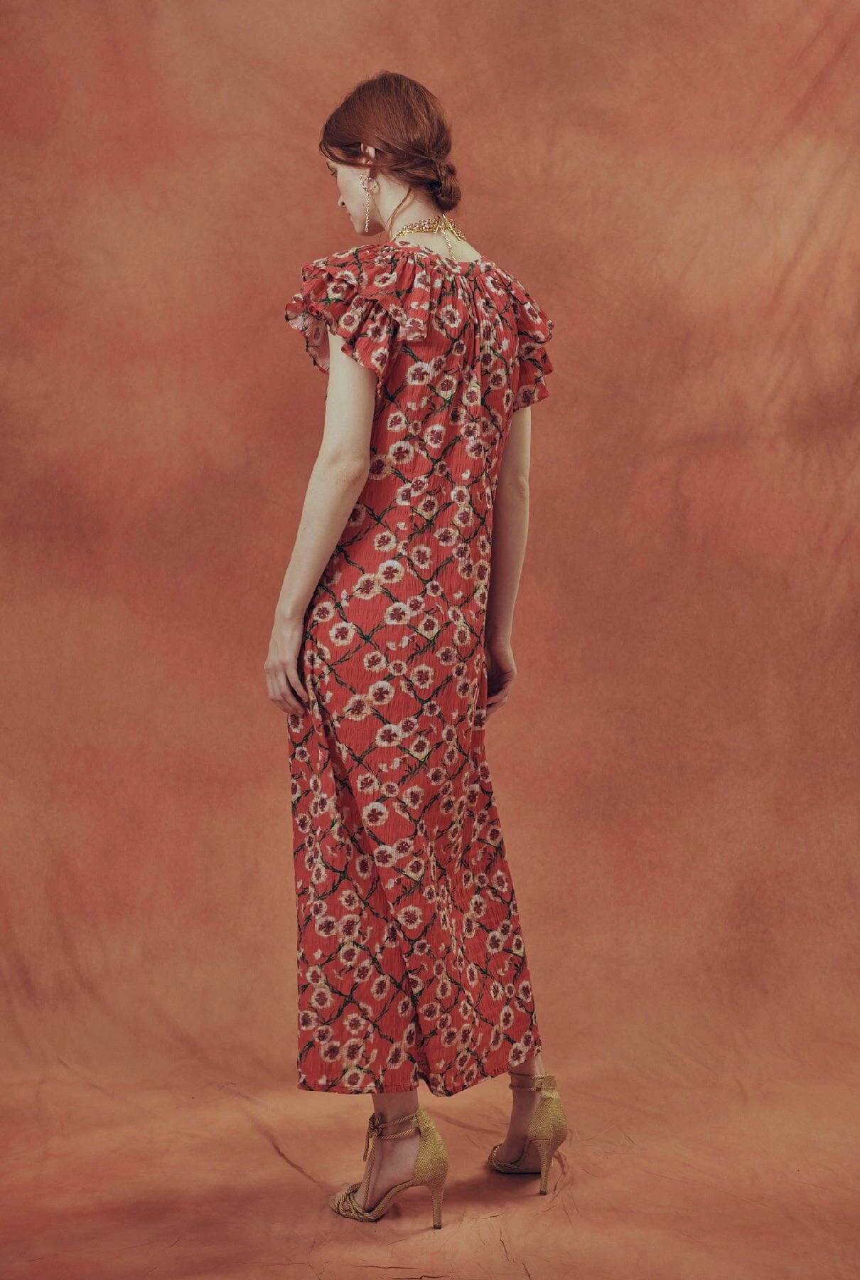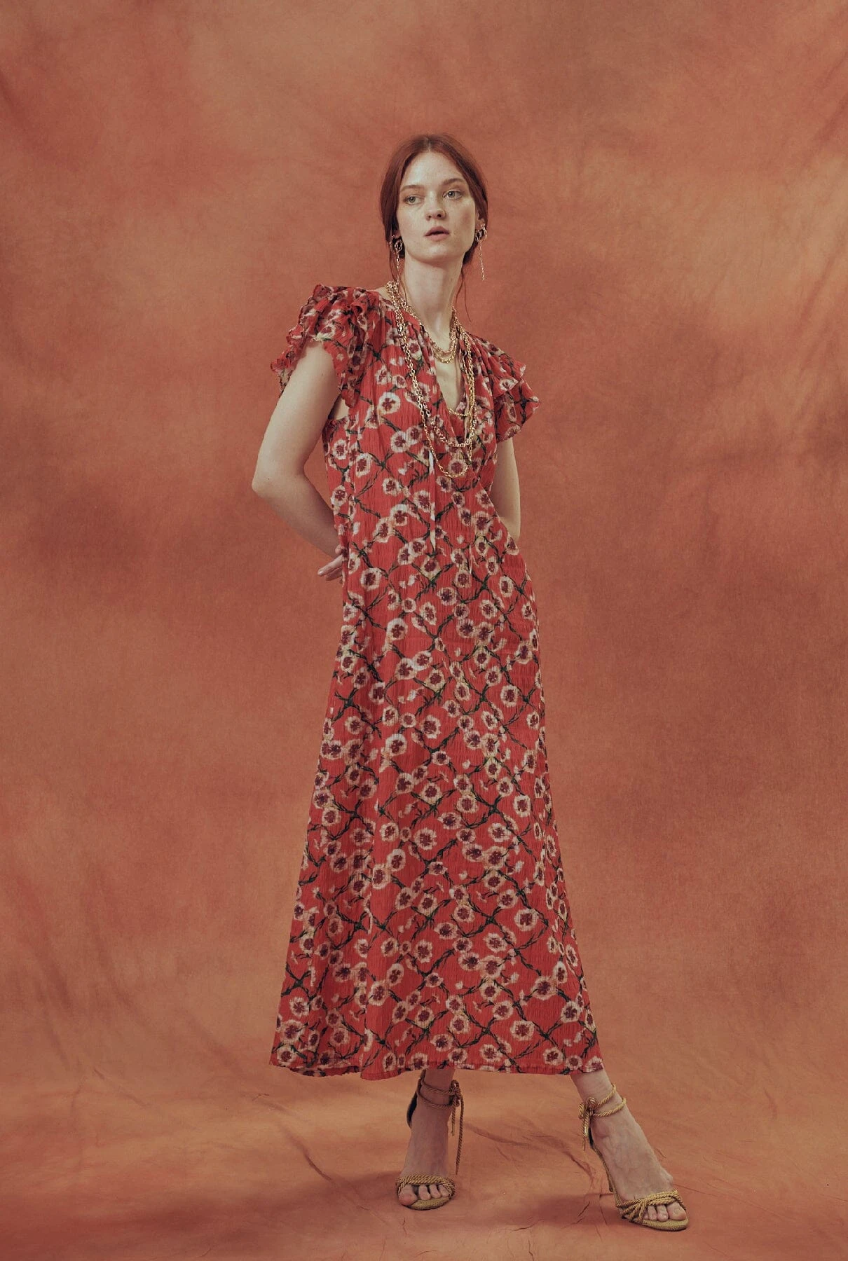 The «Carnations» print is painted in tempera, with small brushstrokes on an orange geometric grid background. Each inflorescence of the «poet’s carnation» is depicted in detail.