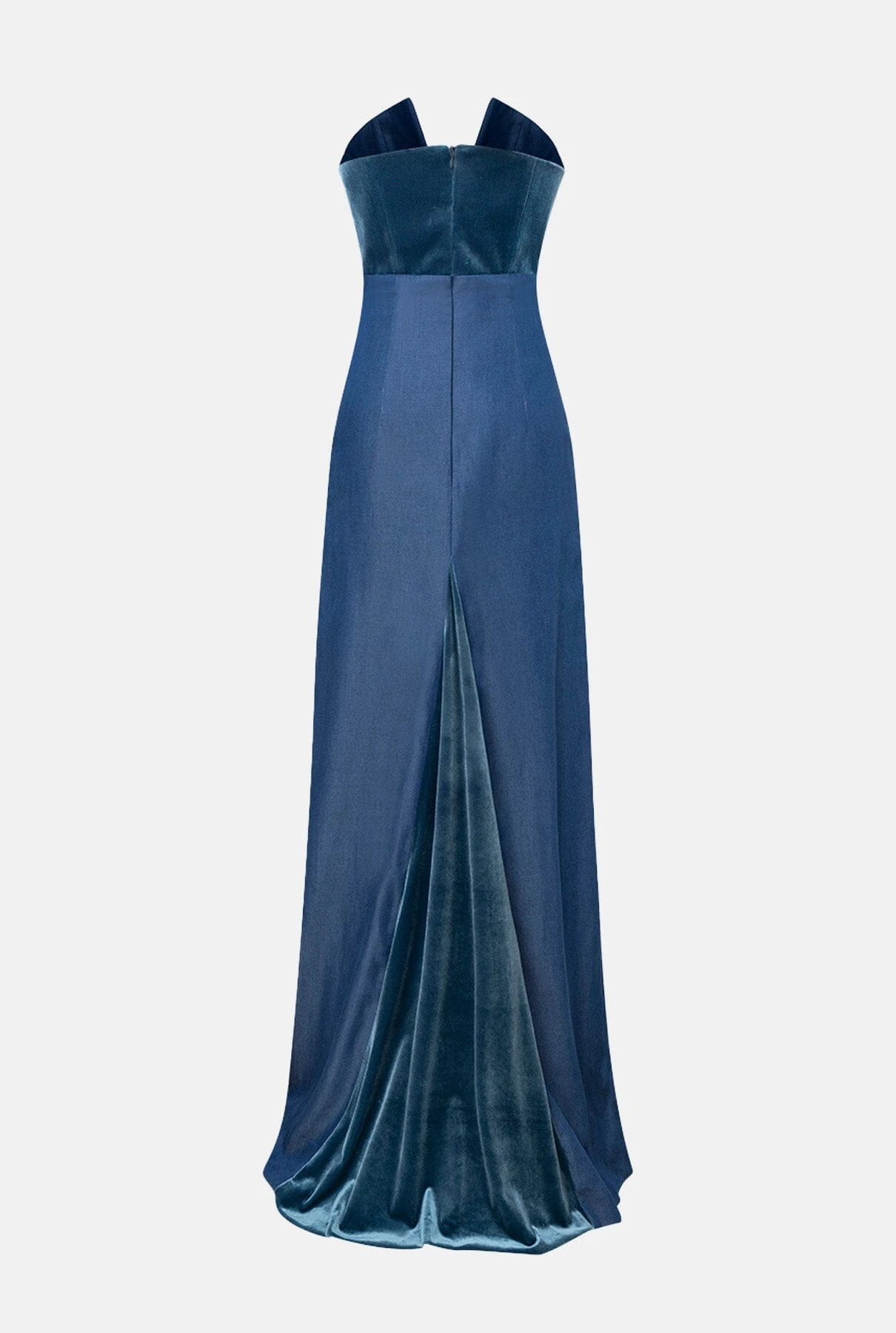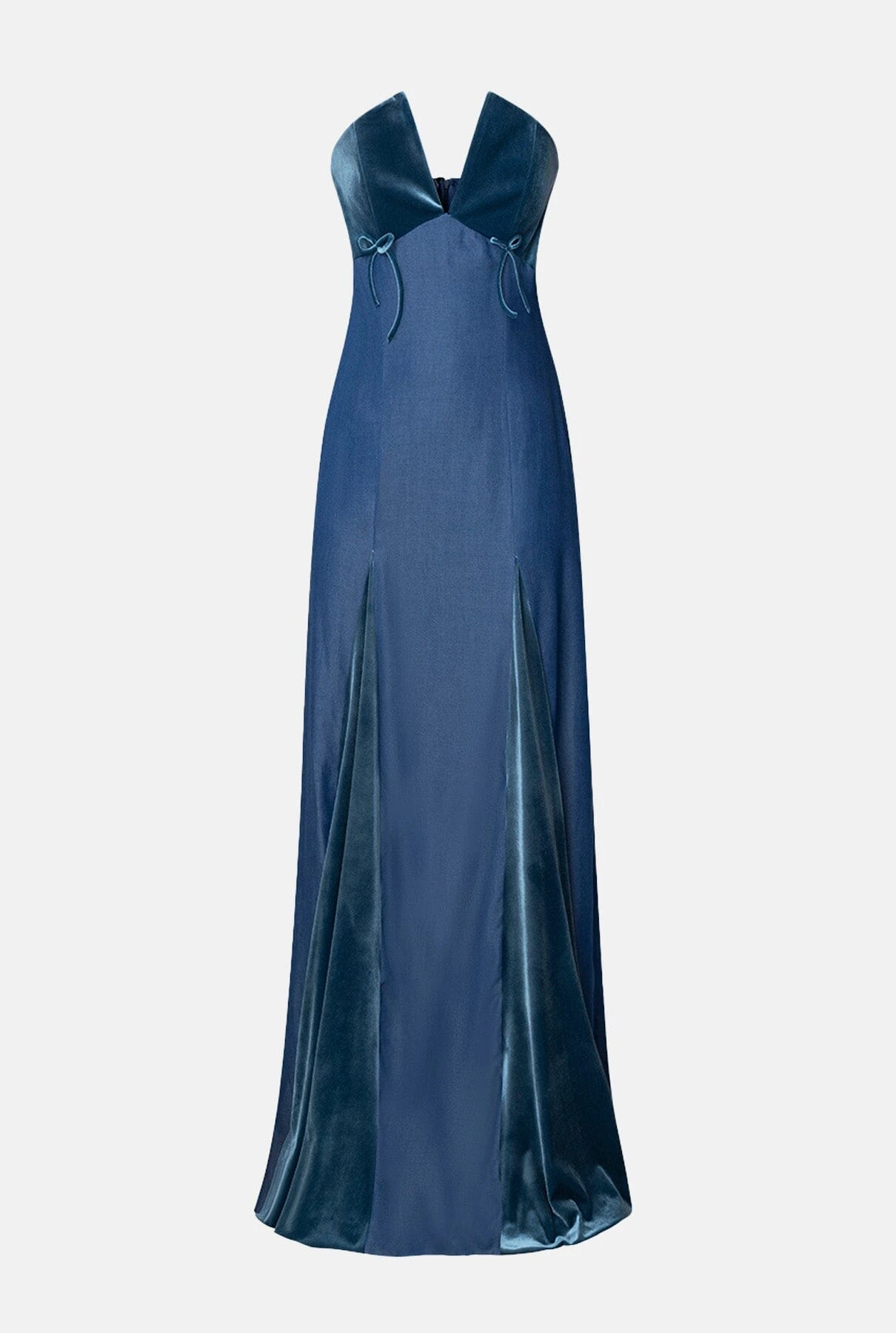 Long dress combined in denim and blue velvet in the body and in the godets of the skirt. Detail of bows on the neckline.